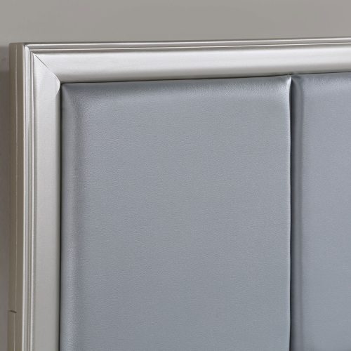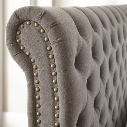 Relax in comfort with the Swanson upholstered bed from Steve Silver Company. A tufted headboard and nailhead trim are just some of the details built into this bed. The rolled headboard and footboard make the bed and stylish statement and the 39 piece rail system ensures a sturdy foundation for your good night’s sleep. Available in king or queen bed, the bed is shown in Gray and is also available in Sand color. -