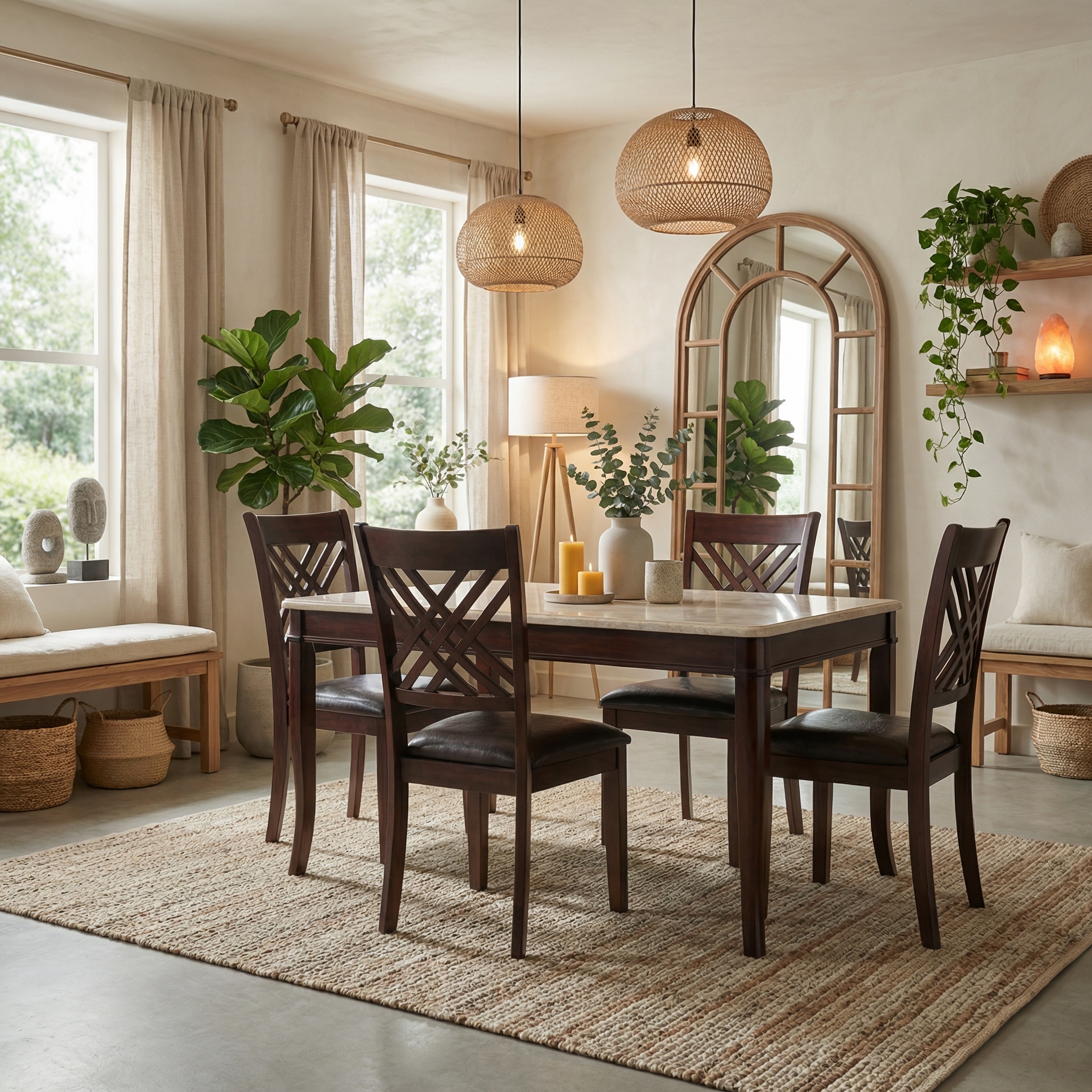 The Adrielle 5-Piece Dining Set blends refined craftsmanship with everyday durability. The set includes the 70-inch Marseille Marble Top Dining Table and four Adrian Side Chairs, expertly crafted from solid Asian hardwoods, engineered woods, and marble veneers. Kiln-dried wood ensures long-lasting stability, while the hand-applied merlot cherry finish highlights natural grain. The table’s ogee marble edge, clipped corners, and French cabriole legs add classic elegance. Adrian Side Chairs feature a designer “X” back and dark brown vegan leather upholstery for sophisticated, easy-care comfort.