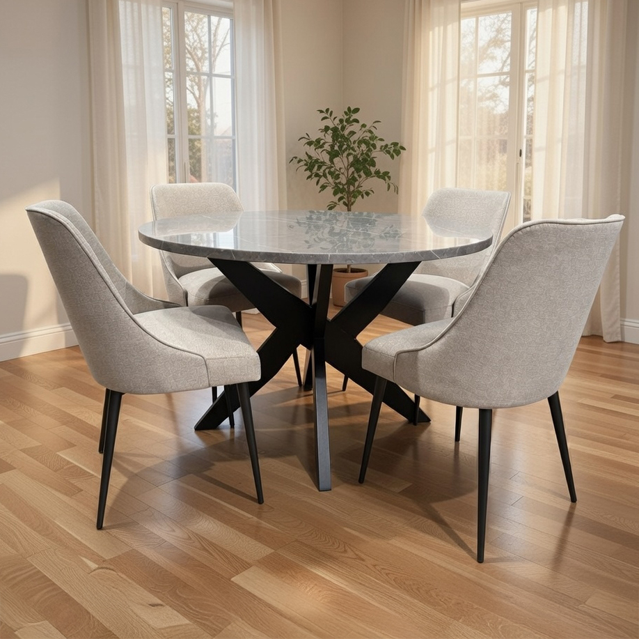 Complete 5-Piece Dining Set: The Amy 48-inch Round Table is a masterful blend of past and present. Its luxurious faux-marble top rests upon a distinctive five-legged contemporary base, drawing inspiration from mid-century modern aesthetics. This juxtaposition of sleek lines and robust ebony-finished legs is both retro and refreshingly current. Beyond its beauty, Amy serves as the backdrop for intimate gatherings, seating four in an ambiance that makes every conversation memorable. Its mid-century vibe, combined with modern flair, ensures that Amy feels at home in both nostalgic and contemporary settings