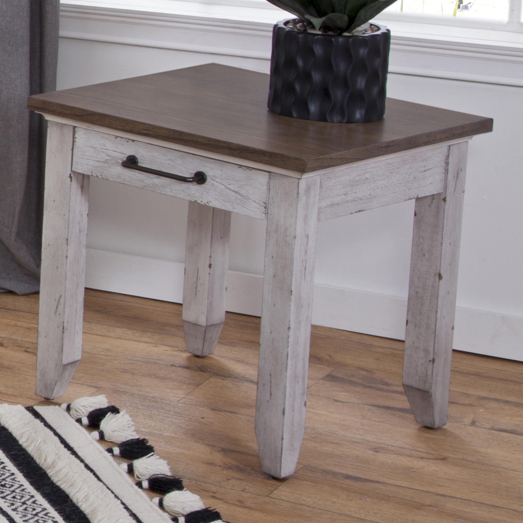 Perfect for your farmhouse inspired home, Bear Creek tables offer just the right mix of casual and rustic inspired designs to blend with today’s decorating environments. The two-tone combination of white and honey smoke finish works well with any casual upholstery setting and features distressing that makes the tables look like vintage heirlooms in any room.