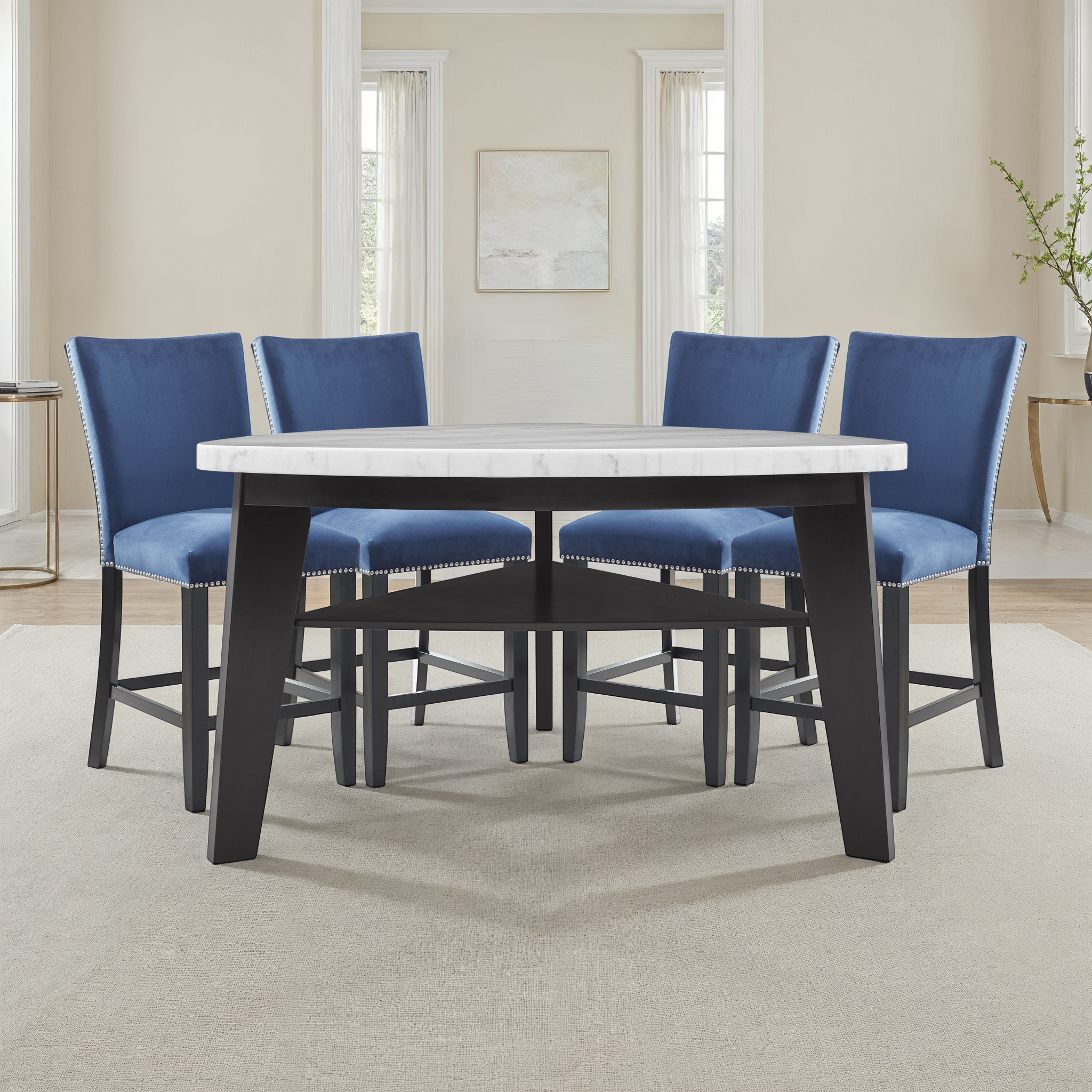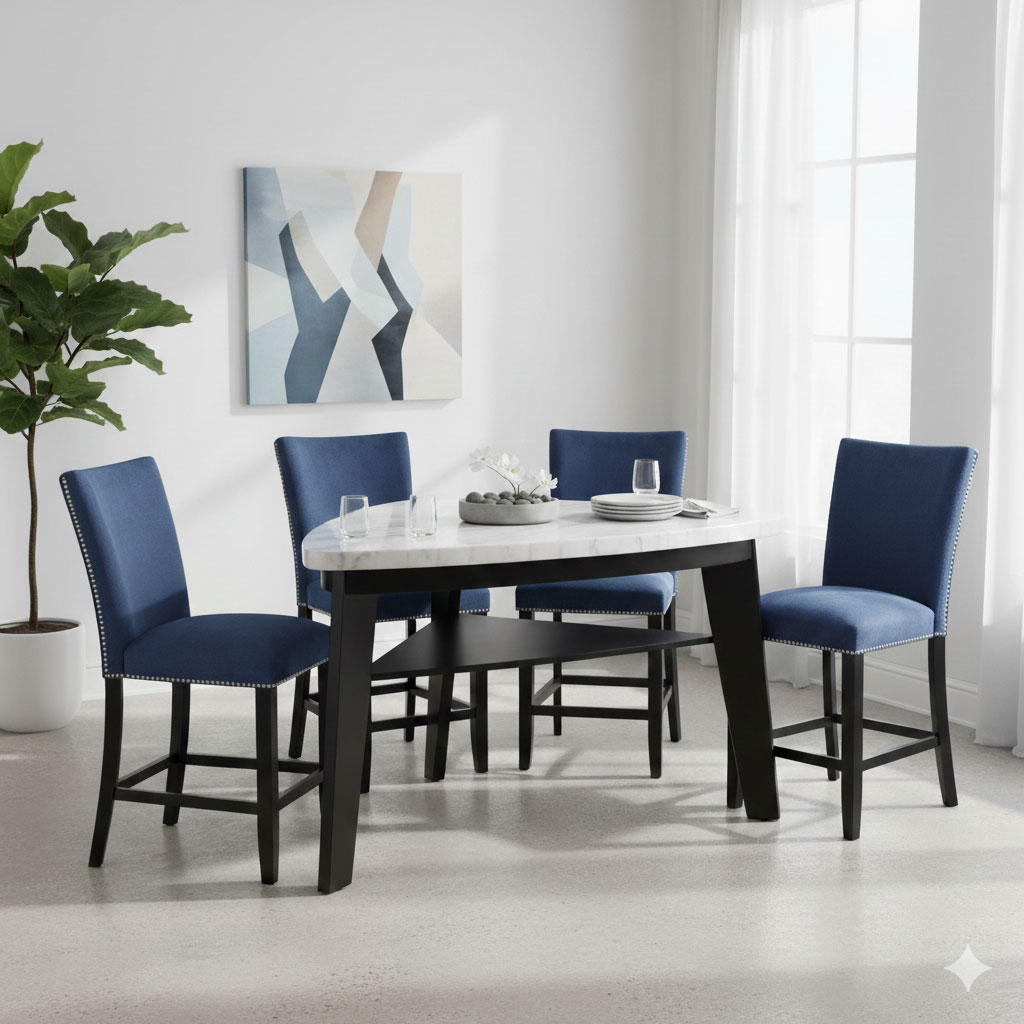 - 5-Piece Set includes the 60″ Triangular Carrara Marble Top Dining Table and 4 Camila Blue Velvet, Nailhead trimmed Counter Chairs.