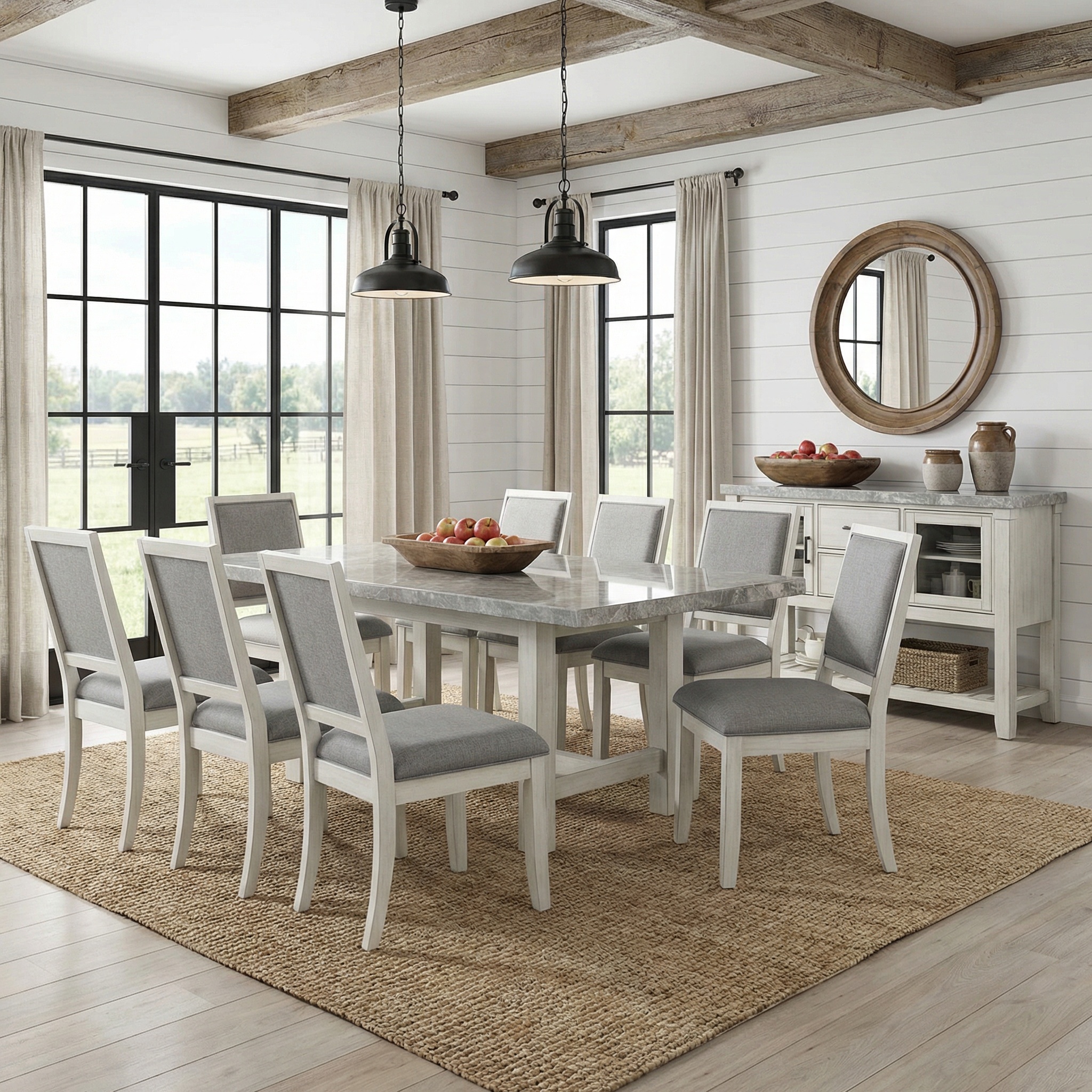 Clean lines and simple sophistication are the hallmarks of the Canova gray marble dining set. A Cathedral White wood finish pairs with gray marble tops to create a rustic yet elegant design that is beautiful in classic, contemporary or farmhouse setting. Gray velvet chairs are easy-to-clean and add comfort to the dining collection. The available Server adds utility to this charming marble set that comfortably seats six for dinner.