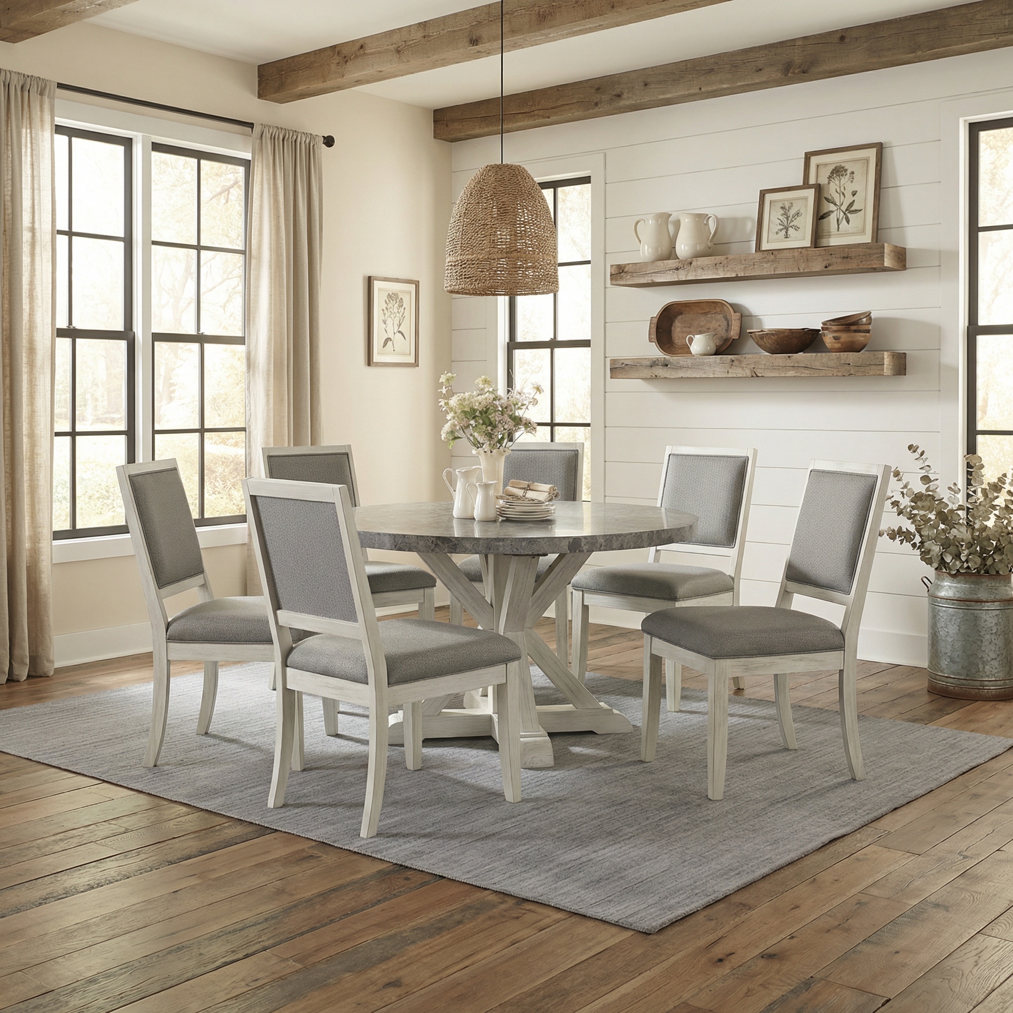 A 52-inch round table with a refined rustic style that combines the polish and beauty of a gray marble top with the rustic complement of a white timber-beam trestle base to form the centerpiece of this charming dining room set. White veining in the gray marble table top blends beautifully with the white finished table base and chairs for a harmonious design that seats up to four. The white and gray microfiber chair matches the set in an easy-care and comfortable seat. The casually elegant style of the table will fit beautifully in farmhouse, cottage, ranch or traditional settings and can be paired with the optional Canova Server for a full dining set.
