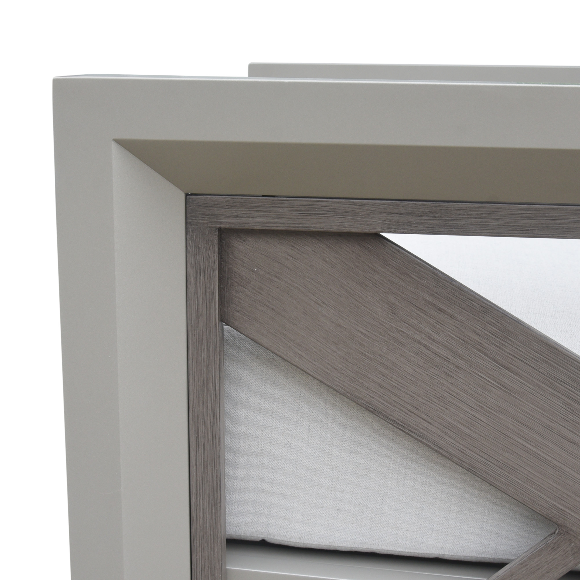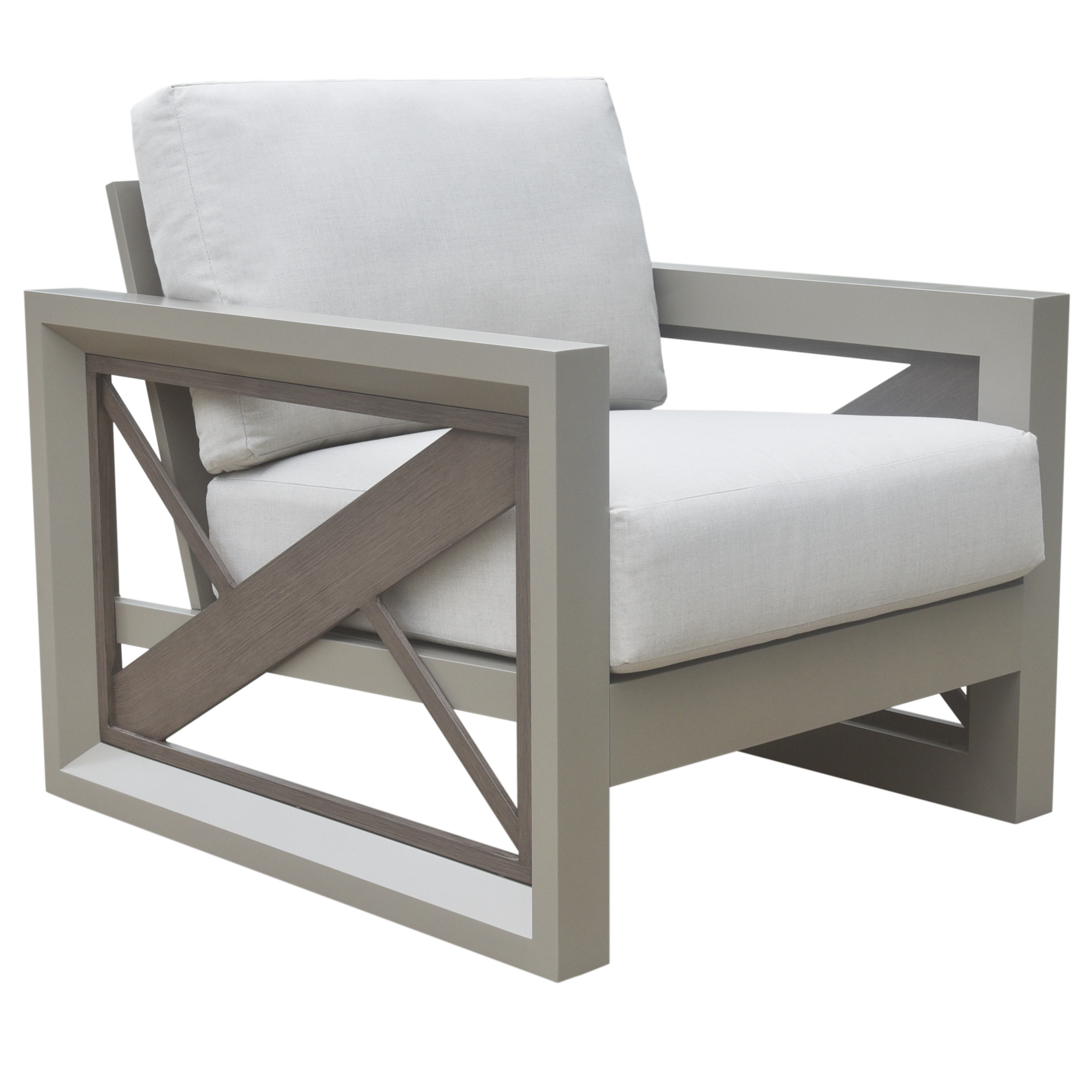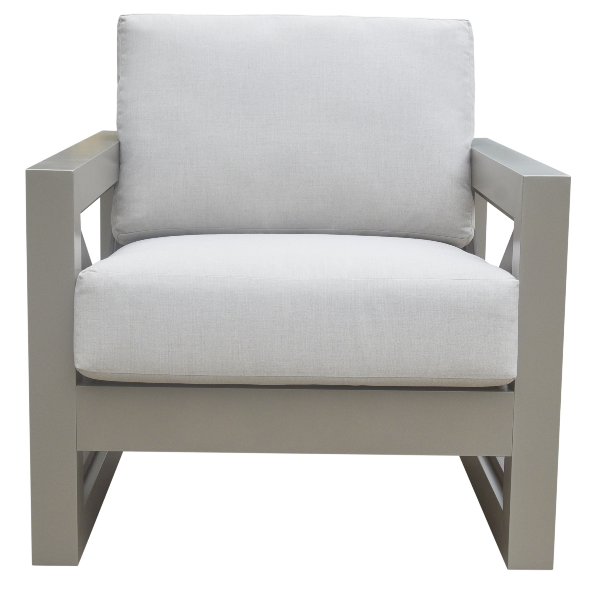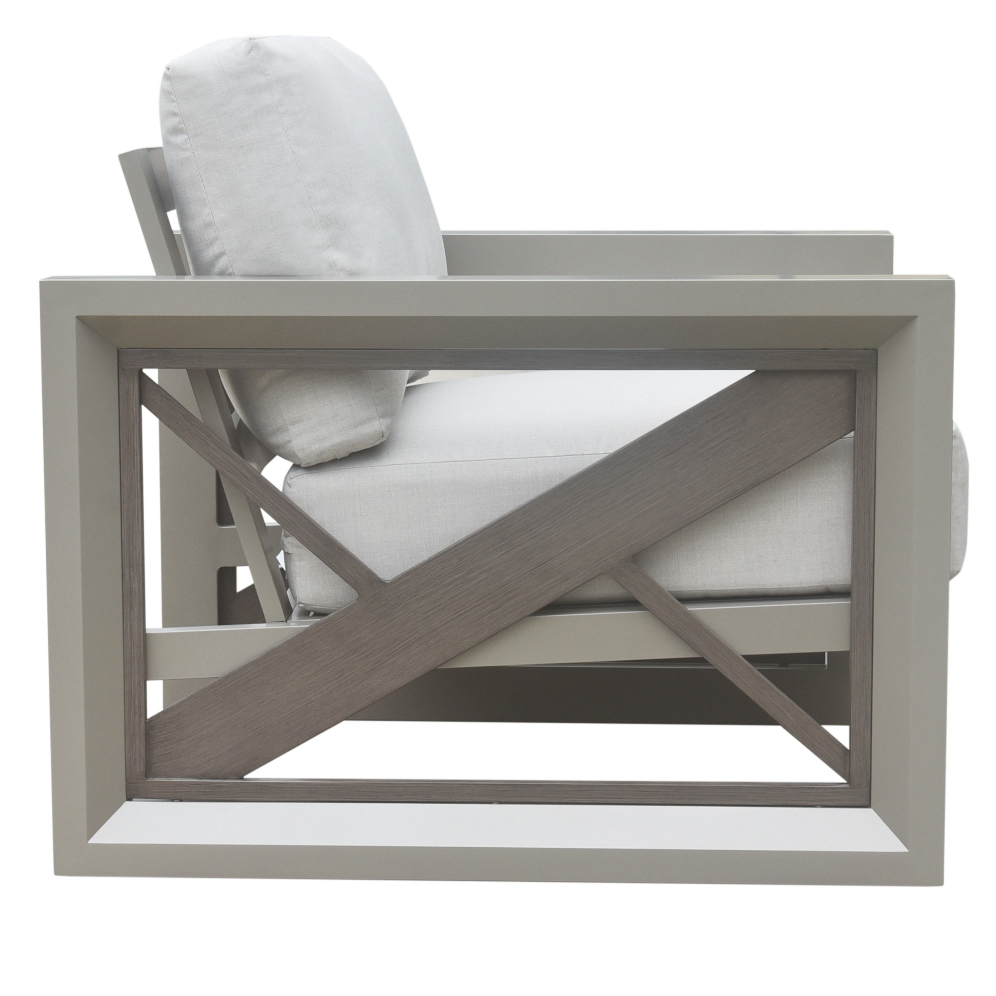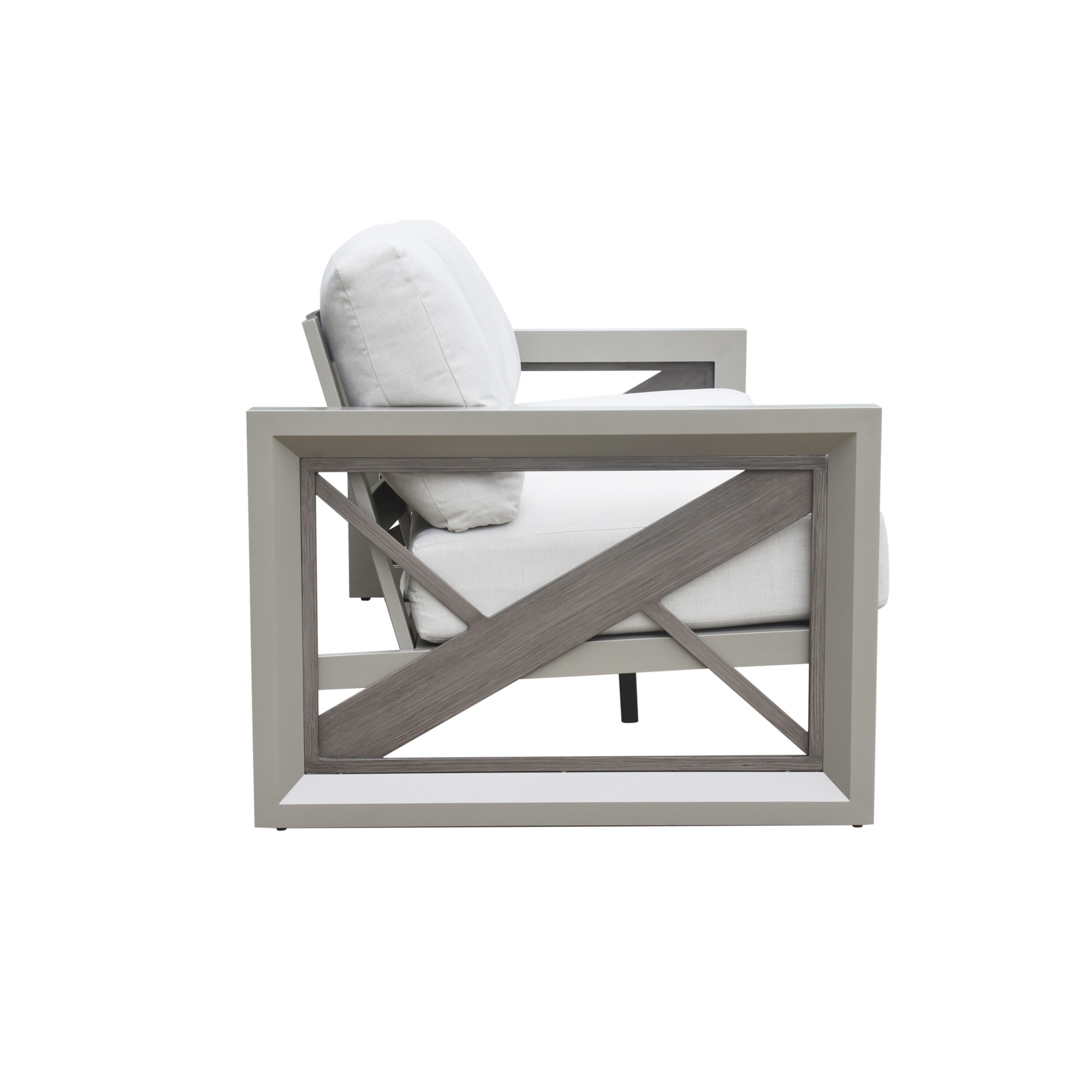 Neutral contemporary style in an outdoor set that will make your patio a showcase. This Sofa looks like it was sculpted for the great outdoors with beveled end panels that frame a modern geometric pattern. And although it looks like an indoor upholstery set, this group is built for the outdoors with rust resistant aluminum frames, solution- dyed acrylics and fast-drying foam cushions.