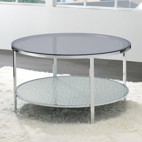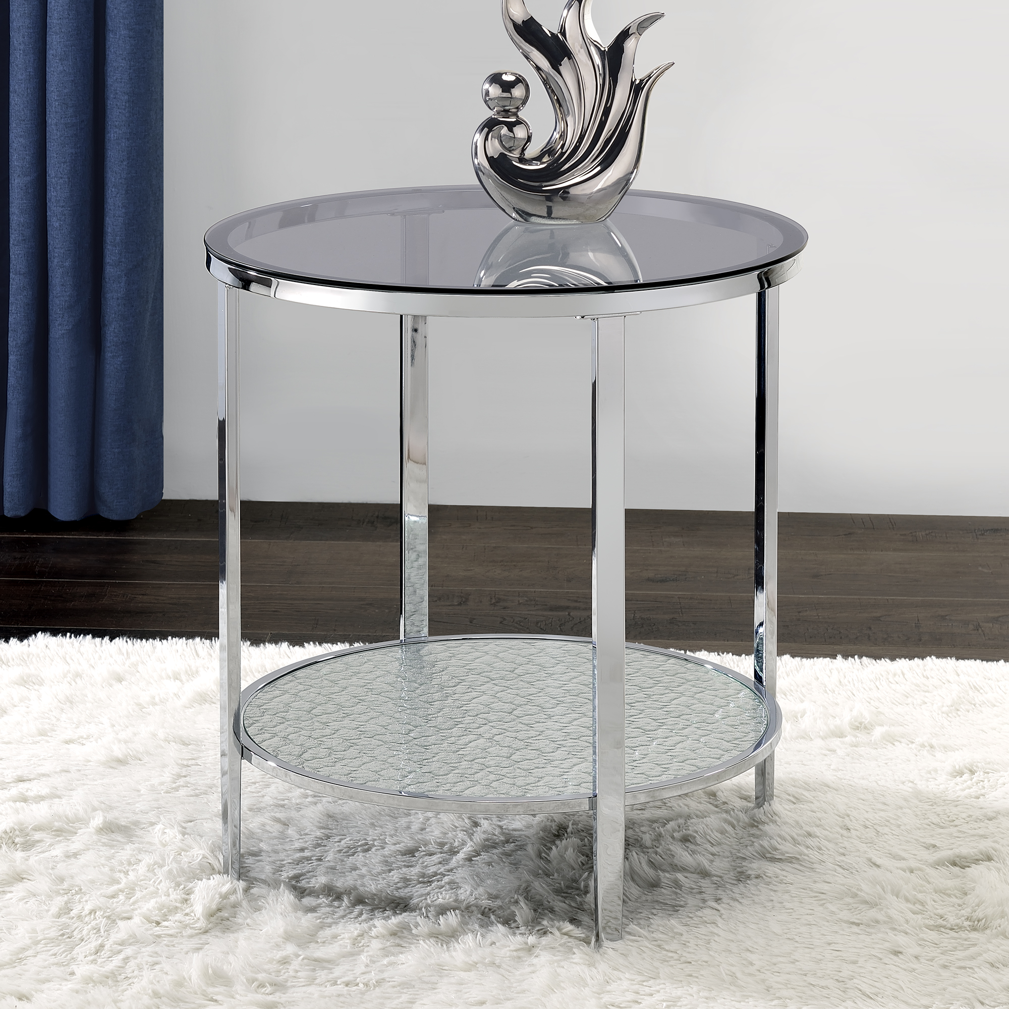 A Smoky glass top, a patterned mirror shelf and a chrome base combine to add sparkle and glam to a room in this romantic round End Table. Frostine features a round shape that softens a room and makes it easier to navigate by eliminating pesky corners. Use with beside your favorite chair, sofa or as a Nightstand in the bedroom and add a little glam to your life.