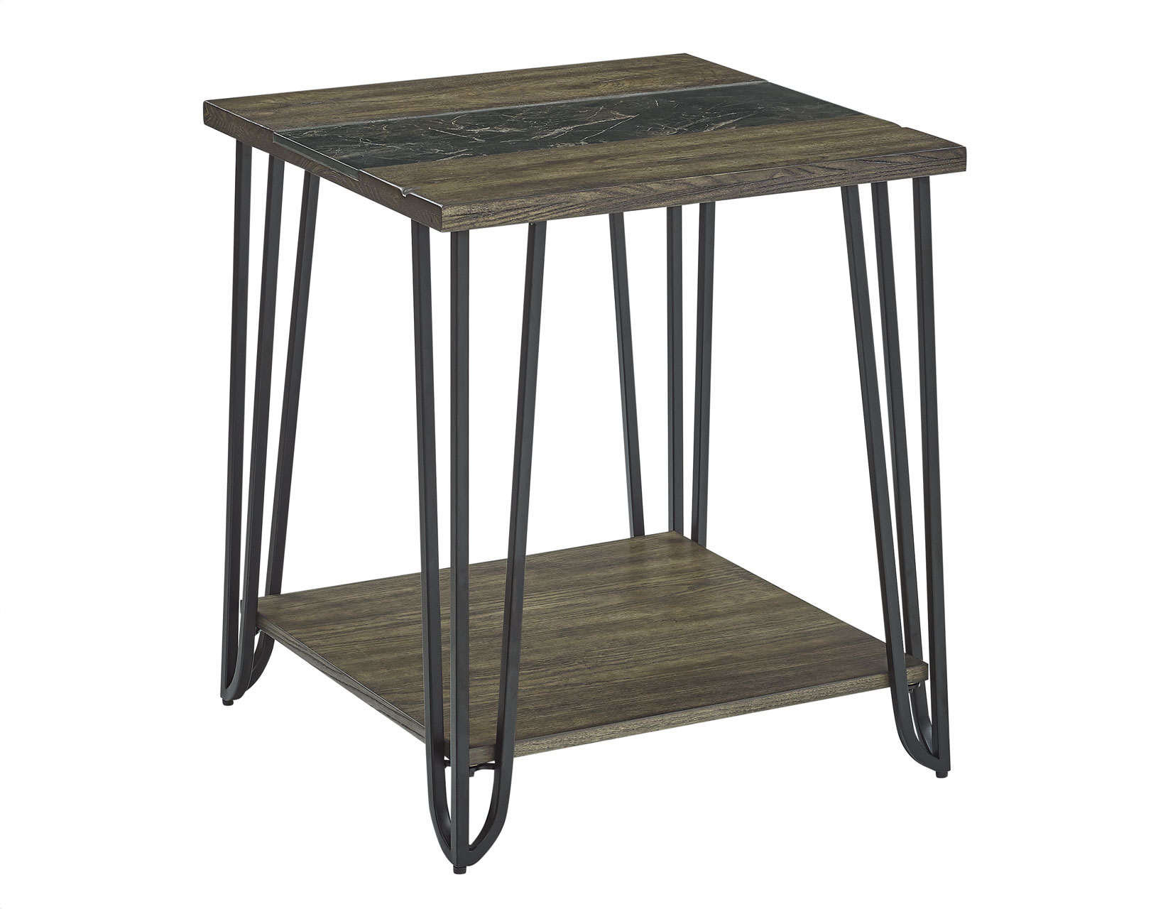 The Harper End Table is a masterful blend of casual rustic charm and mid-century modern elegance. Crafted with a distressed dark driftwood finish and a striking sintered stone inlay, it’s a mixed-media gem that is the perfect side table or bedside companion. Its canted iron legs add a touch of retro flair, while the bottom shelf offers ample space for display or storage. This table is an ideal centerpiece for a casual yet modern living room, offering both style and functionality.