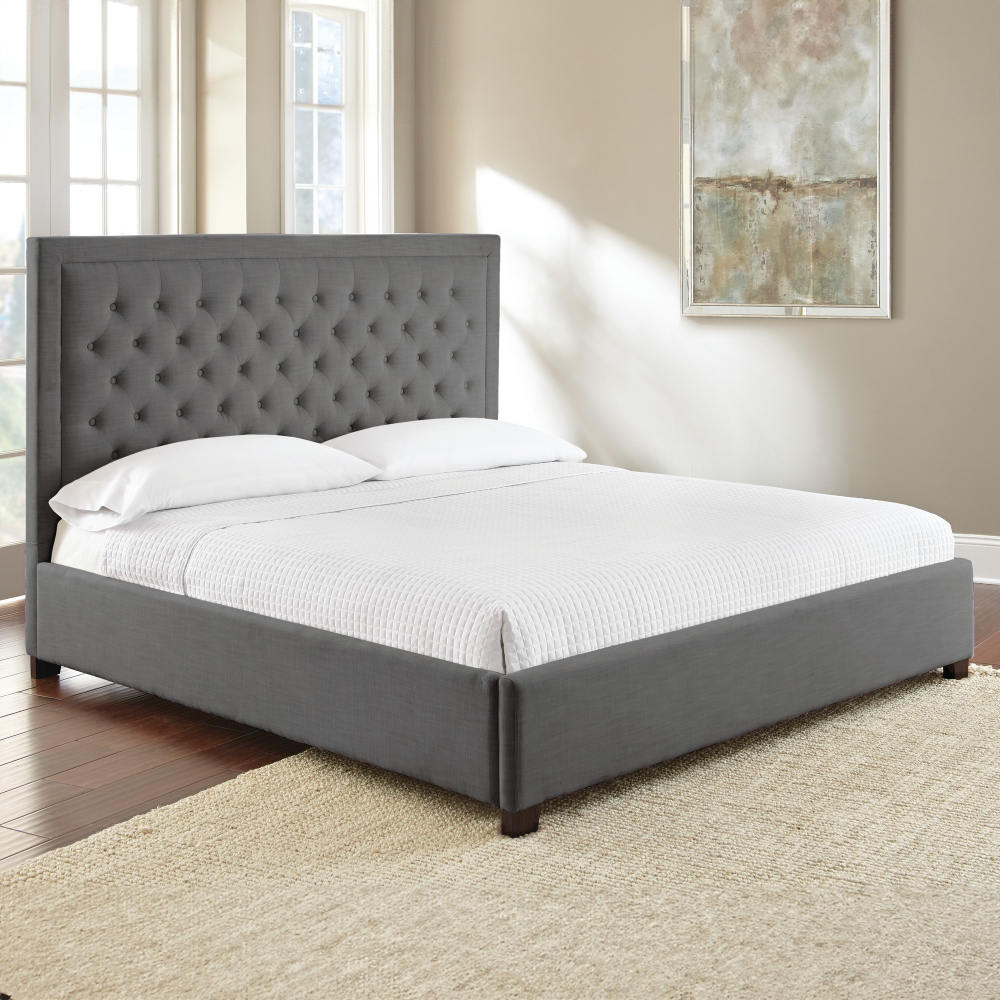 - Footboard ships complete with side rails and slat package that includes center support system to accommodate foundation and mattress or use as a platform bedClean lines mark the transitional style of the gray Isadora bed with styling details such as button tufted headboard. Available as a bed in gray, sand or white color options.