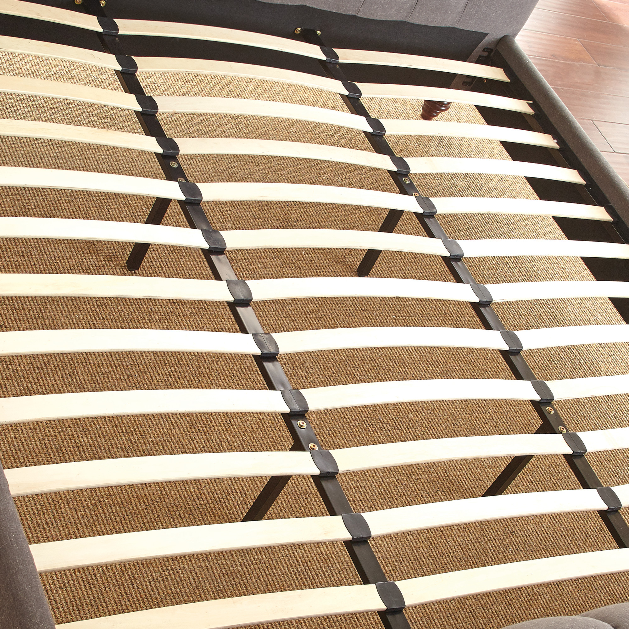 - Styling details include a button panel headboard with upholstered footboard and side rails with solid wood feet