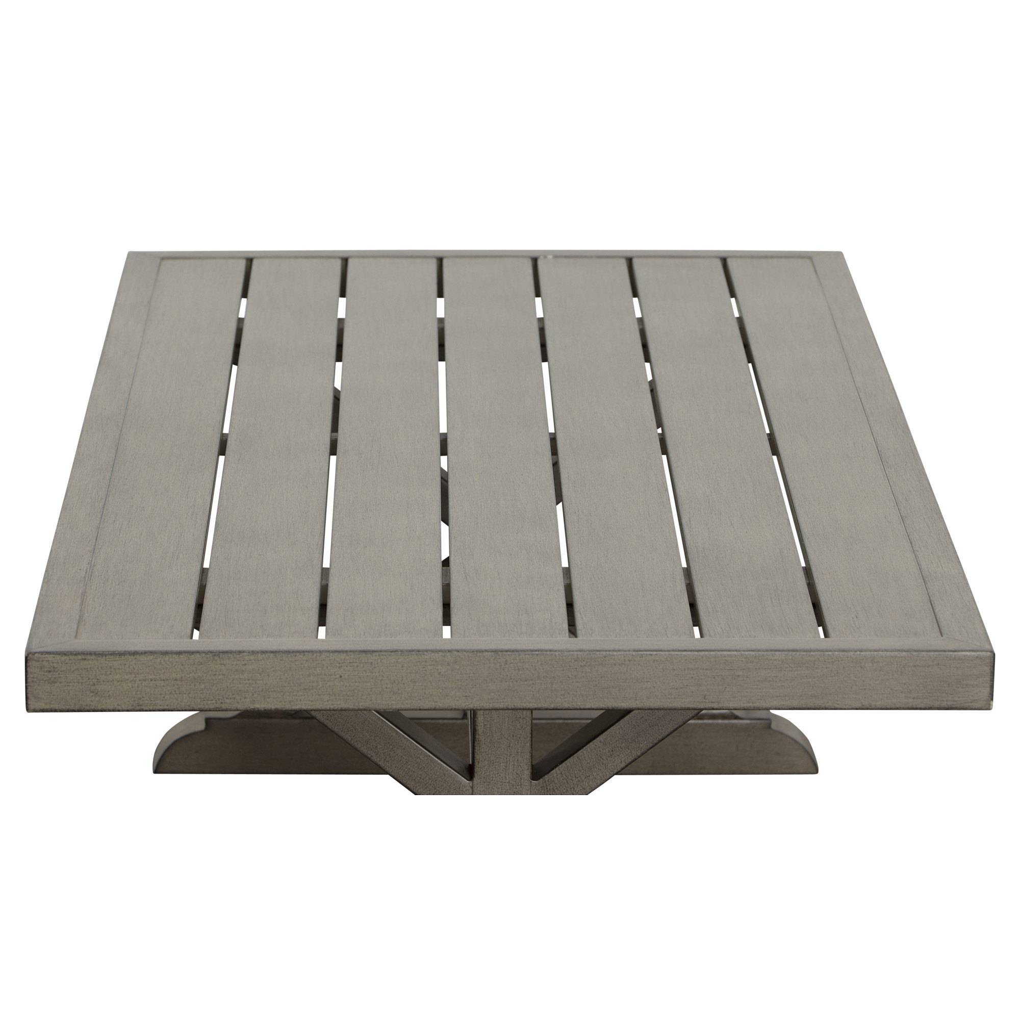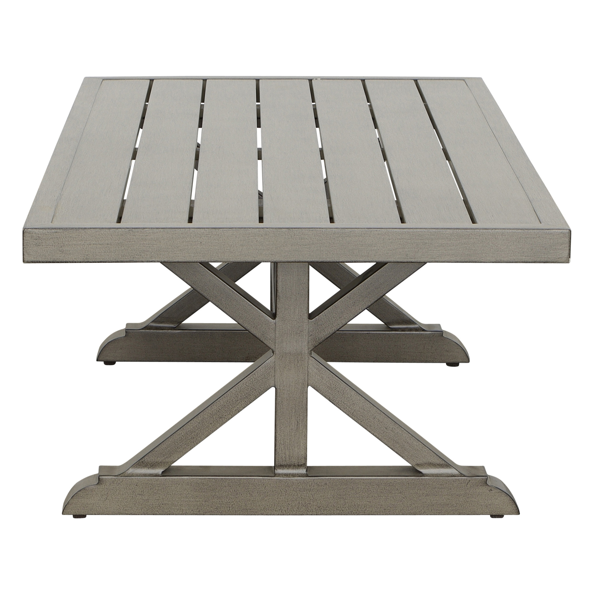 Crafted from powder-coated aluminum, this rust-resistant and color-fast table withstands any weather condition. Its plank top allows water to run through, making it suitable for outdoor use. Add modern elegance to your sunroom or indoor area with this sleek and sturdy coffee table. Complement your outdoor space with the Jones collection or any other seating arrangement.