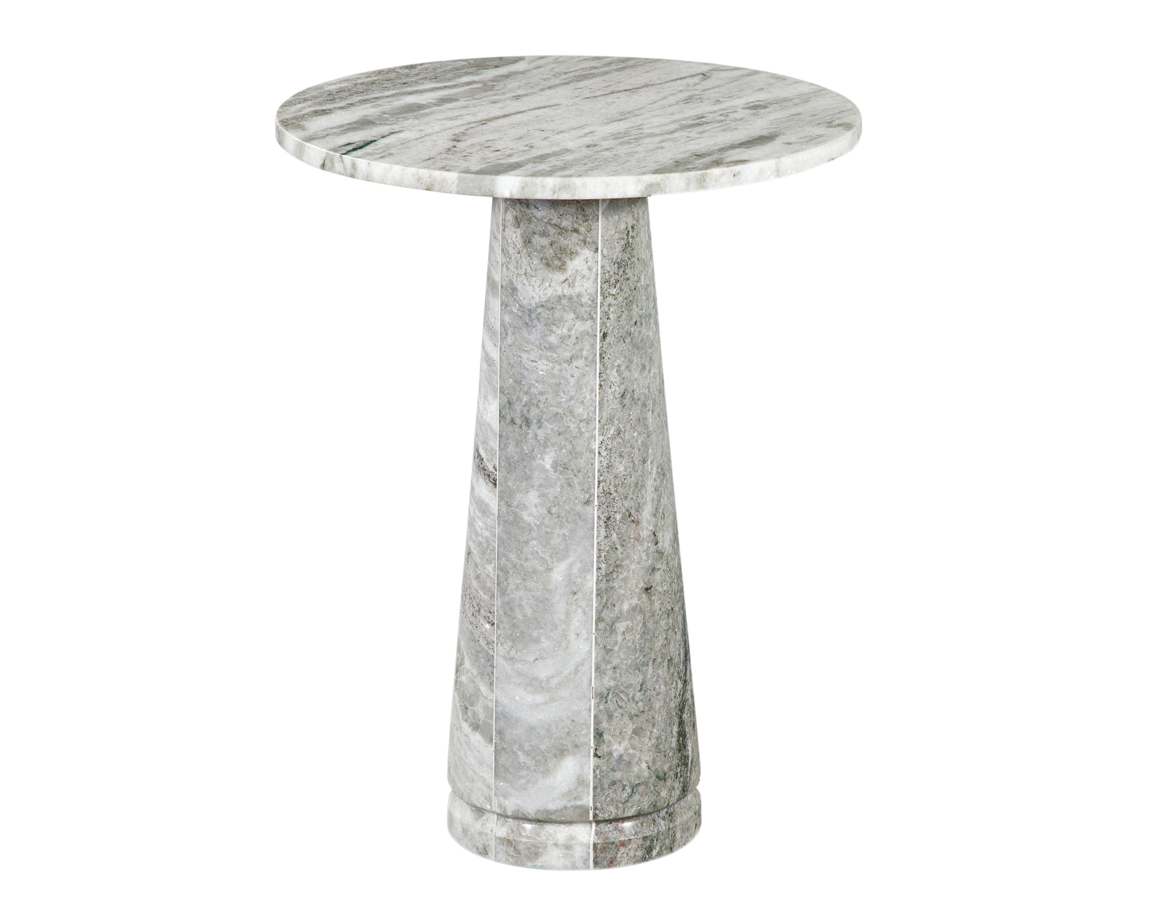 The Joni Accent Table combines natural elegance with sculptural design. Its 18-inch round Fantasy Gray marble top rests on a graceful teardrop-shaped base, each piece uniquely veined with soft earth-toned swirls and warm undertones. Mined and hand-finished, no two are exactly alike. Perfect beside a chair or as a nightstand, Joni brings warmth, luxury, and organic texture to any space—a true statement piece that highlights the timeless artistry of natural stone