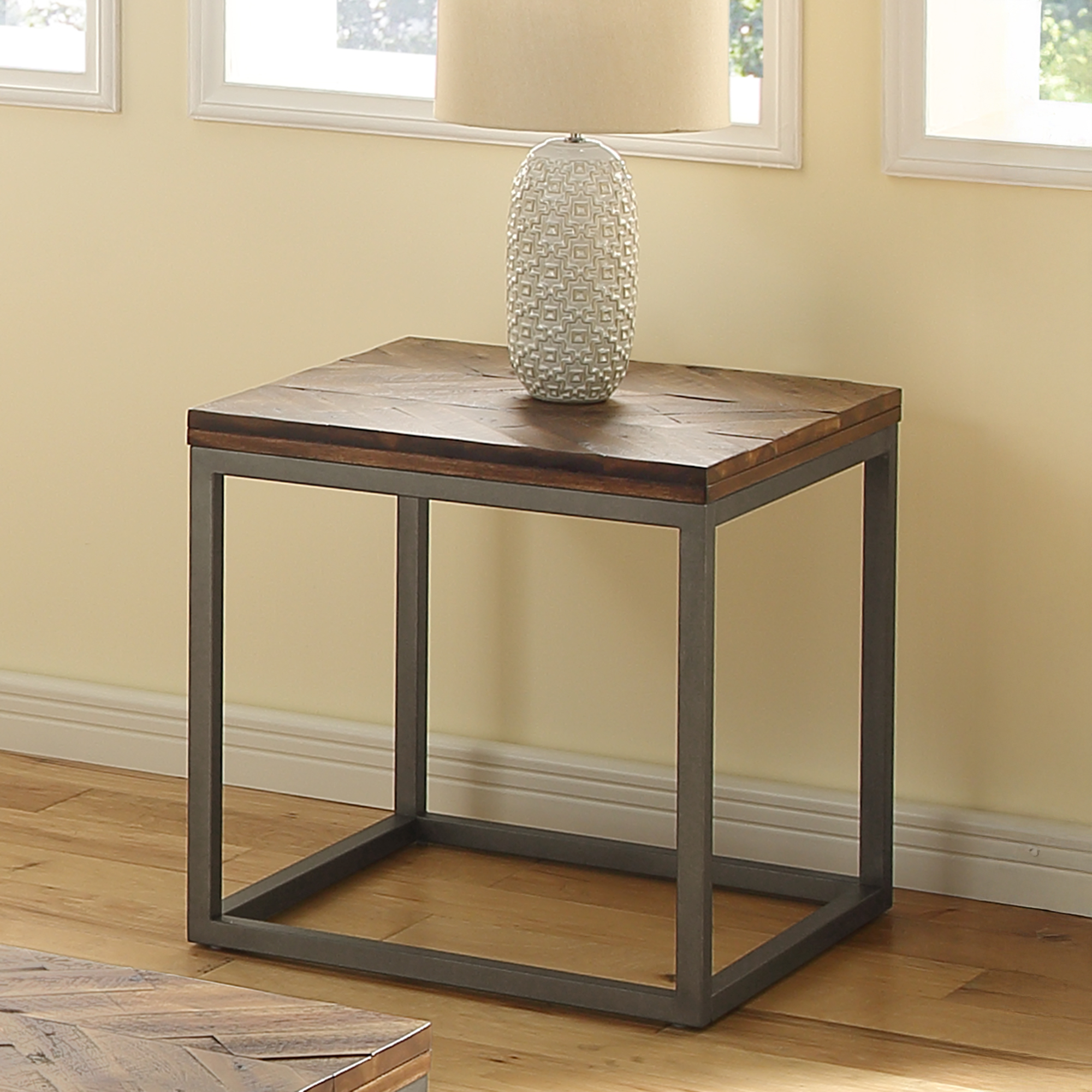 • Styling details include distressed top in chevron pattern with a natural honey finish and sturdy metal support base