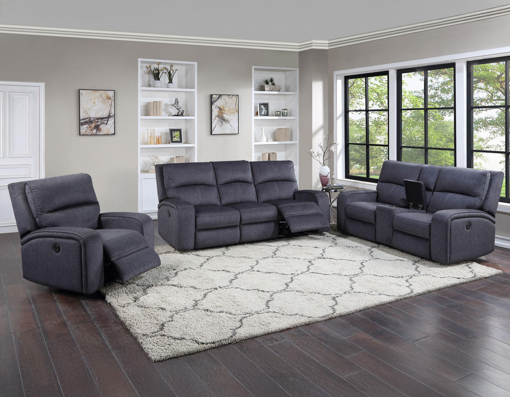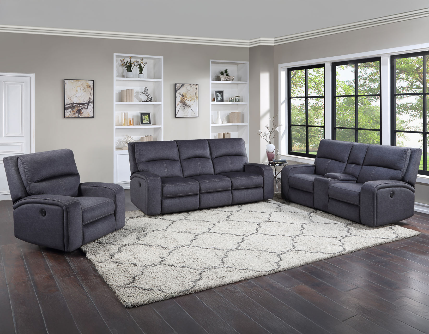 A power reclining set, Lovell offers incredible comfort is a classically styled motion group. Powerootrest operate at the touch of a button while the intricate stitching covers all the details.