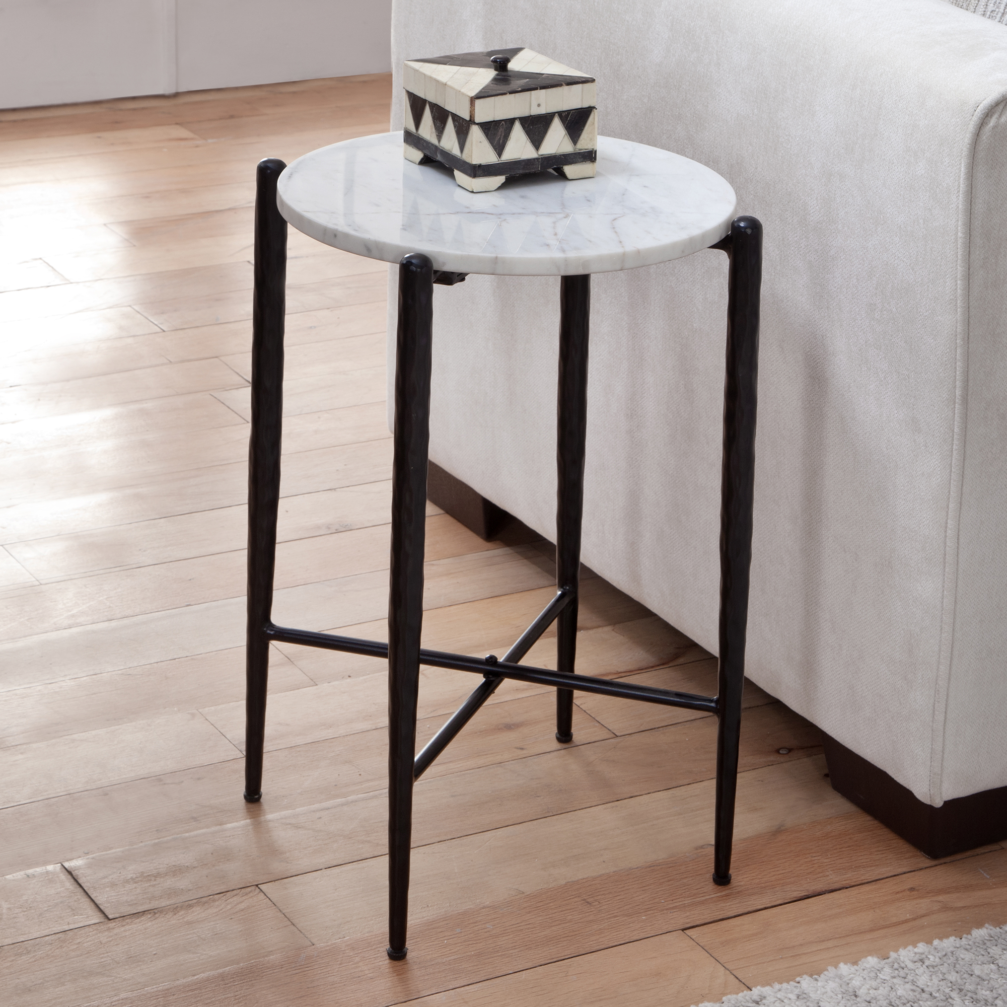 The Loxie Solid Marble Top 16″ Round End Table combines delicate elegance with surprising strength An able companion to a favorite chair, this compact table features a flowing round shape with a solid white marble top nestled in a beautifully tapered, powder-coated iron base. With its refined design and sturdy construction, the Loxie table is a versatile piece that brings timeless elegance to any room.