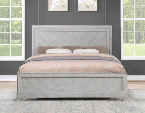 - The wood is hand-stained in a multi-step matte gray finish to highlight the natural grain and knots of the wood