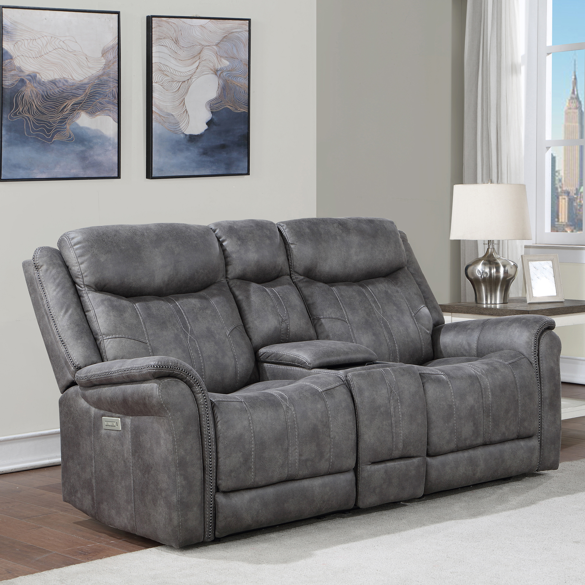 A mix of traditional and modern elements create a transitional design in Morrison. A cool gray faux-suede cover is neutral for most color schemes with a butter-soft touch that combines with power footrest and power headrest for a comfortable Console Loveseat built to last. Concealed cupholders pop-out with a quick touch and the built-in console is a great place to store remotes.