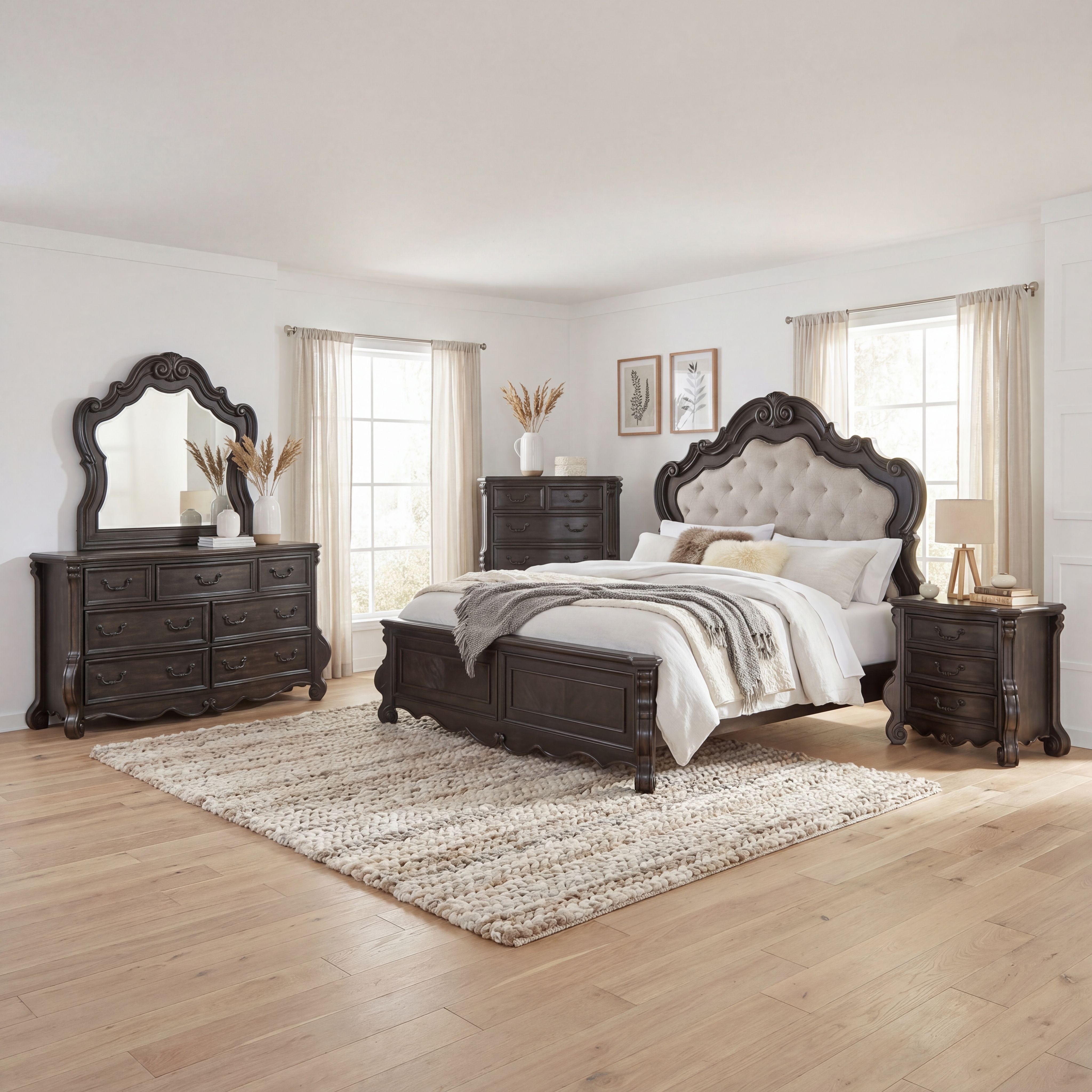 Rhapsody presents a comfortable and opulently traditional bedroom collection in this Panel Bedroom set. The button-tufted Panel Bed sets the tone for this collection with scrolled framework, fluted pilasters, and elevated feet – details that are echoed in the case pieces of the group. The multi-step molasses finish features edge rubthrough that replicates the look of a loved heirloom antique.