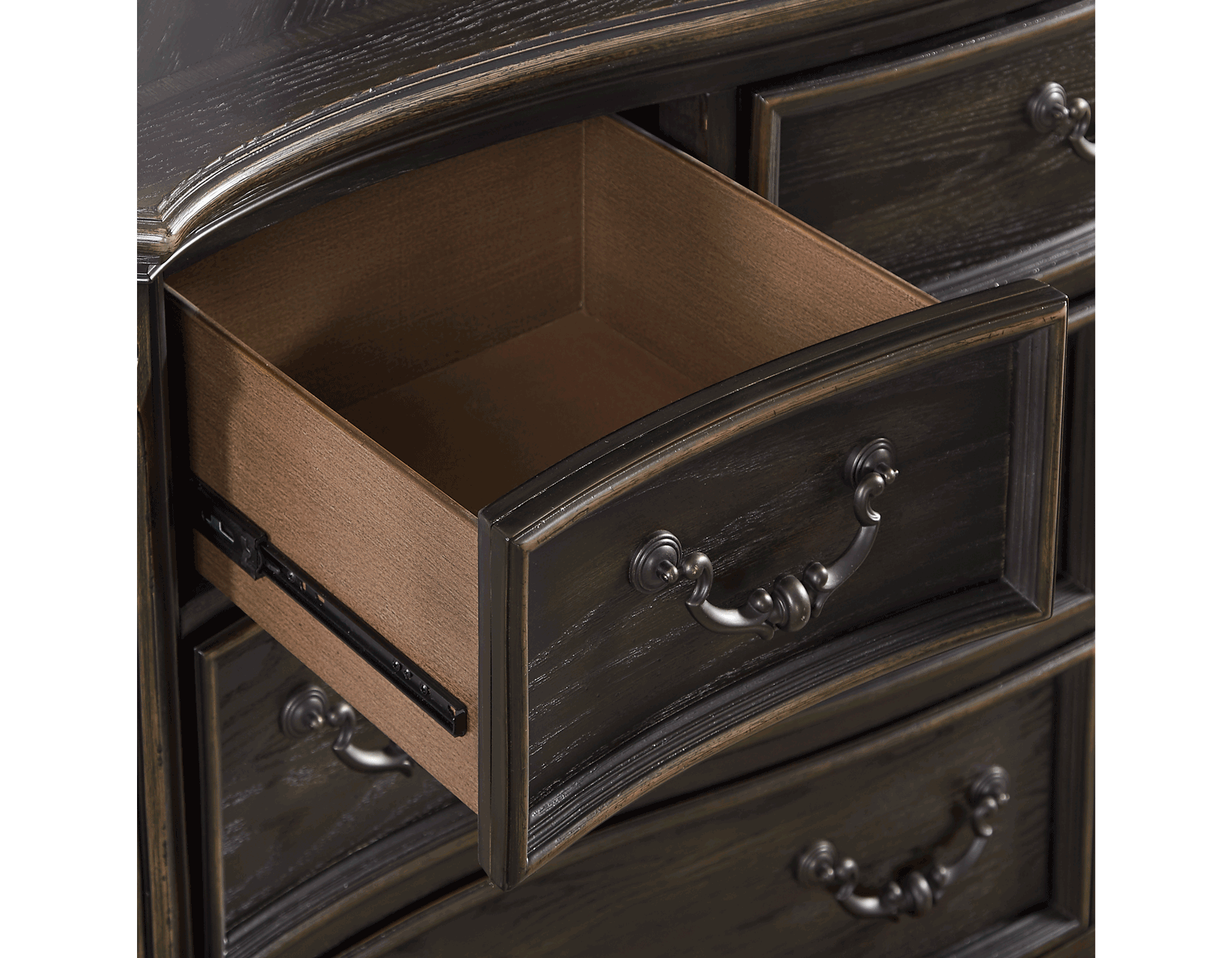 - Styling details include shaped Dresser fronts and drawers that duplicate the look and feel of antique furniture; fluted pilasters with scrolled feet, intricately shaped mirror with carving effect details and scrollwork on sides and top, button tufted headboard and footboard with scalloped, scrolled headboard, fluted pilasters and scrolled feet.
