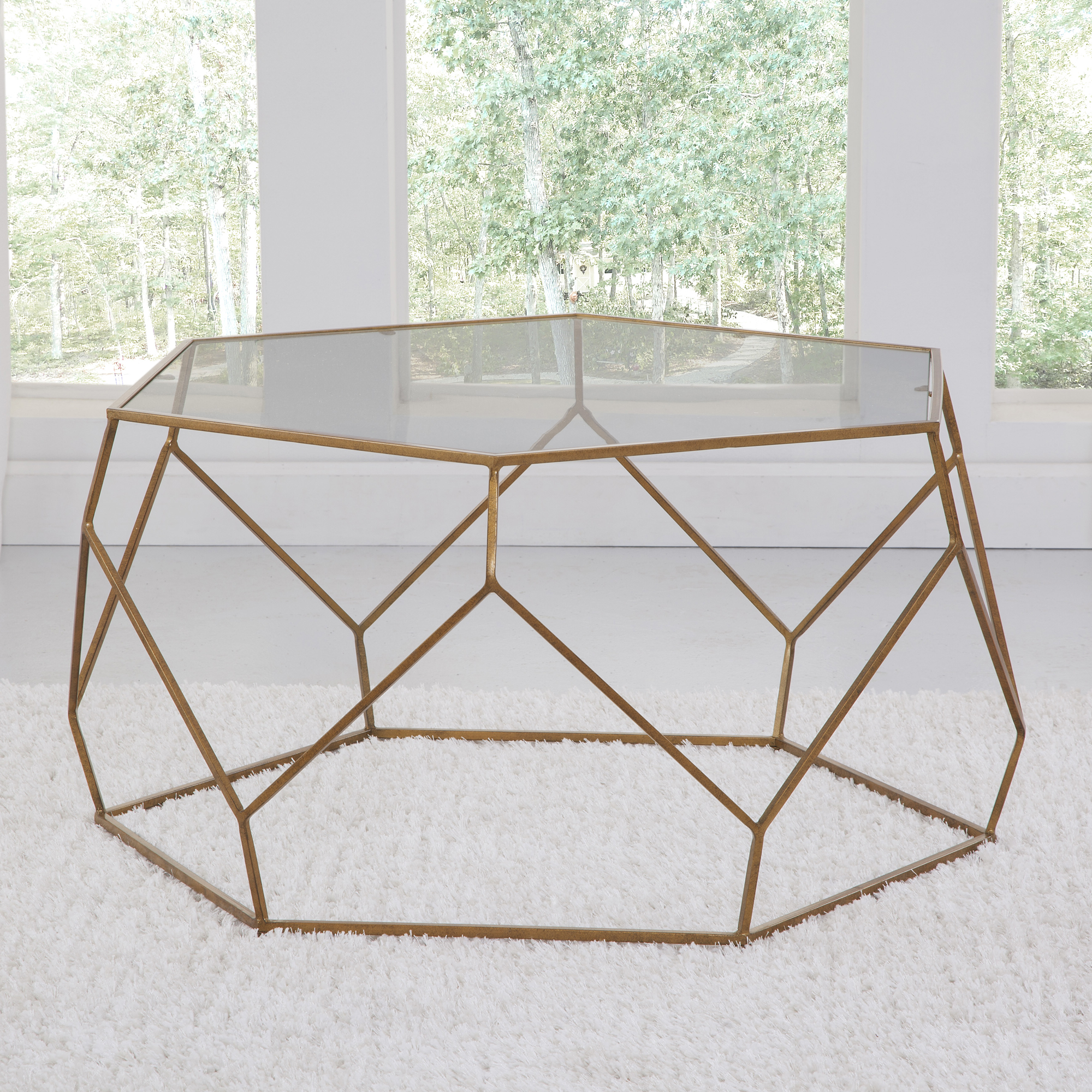 A light and airy table collection with an interesting hexagonal shape, Roxy mixes metal and glass to form a mixed media set that will brighten any living room. The honeycomb metal base adds glamor and style to the set with a standout gold powder-coated base while the clear glass top allows the base its proper display.