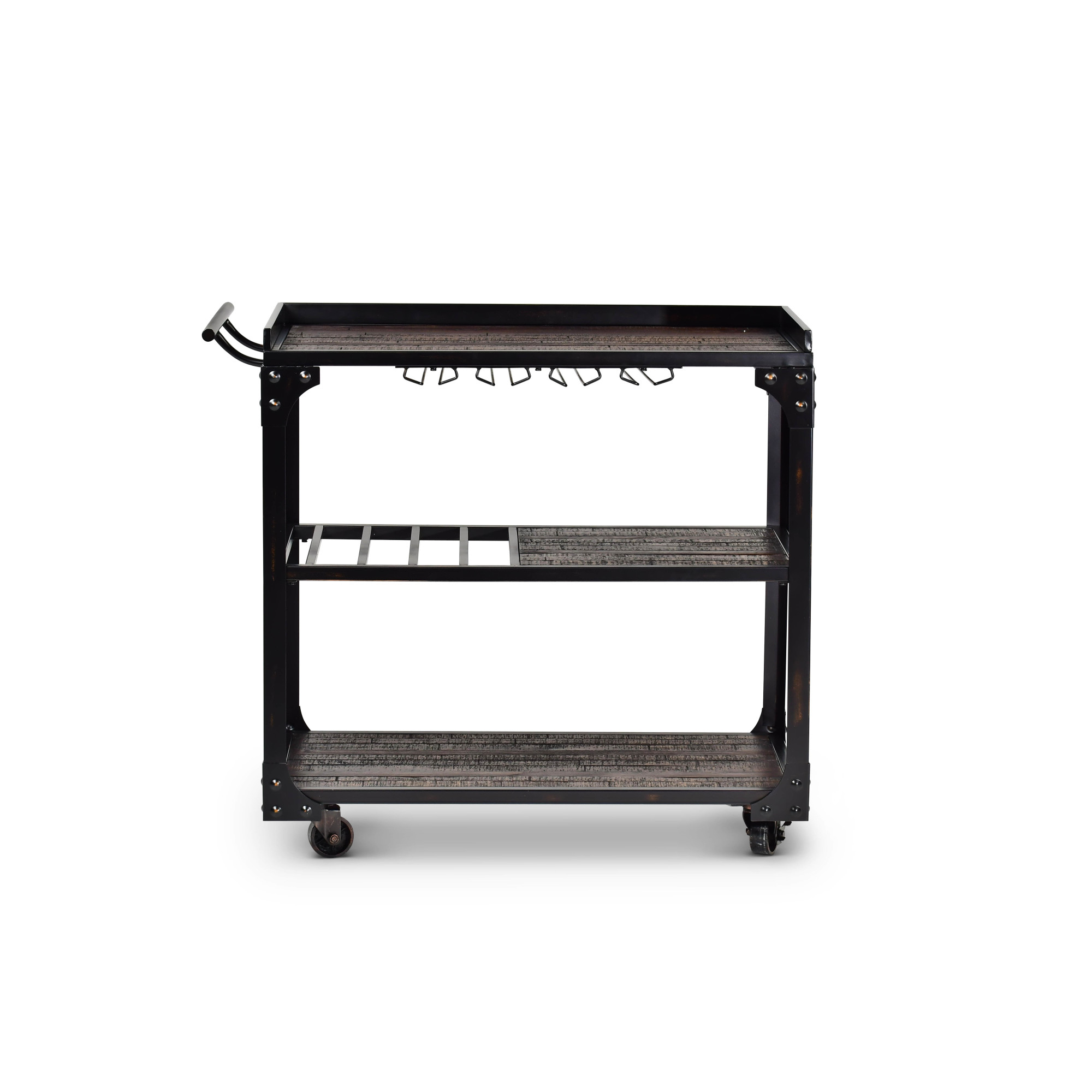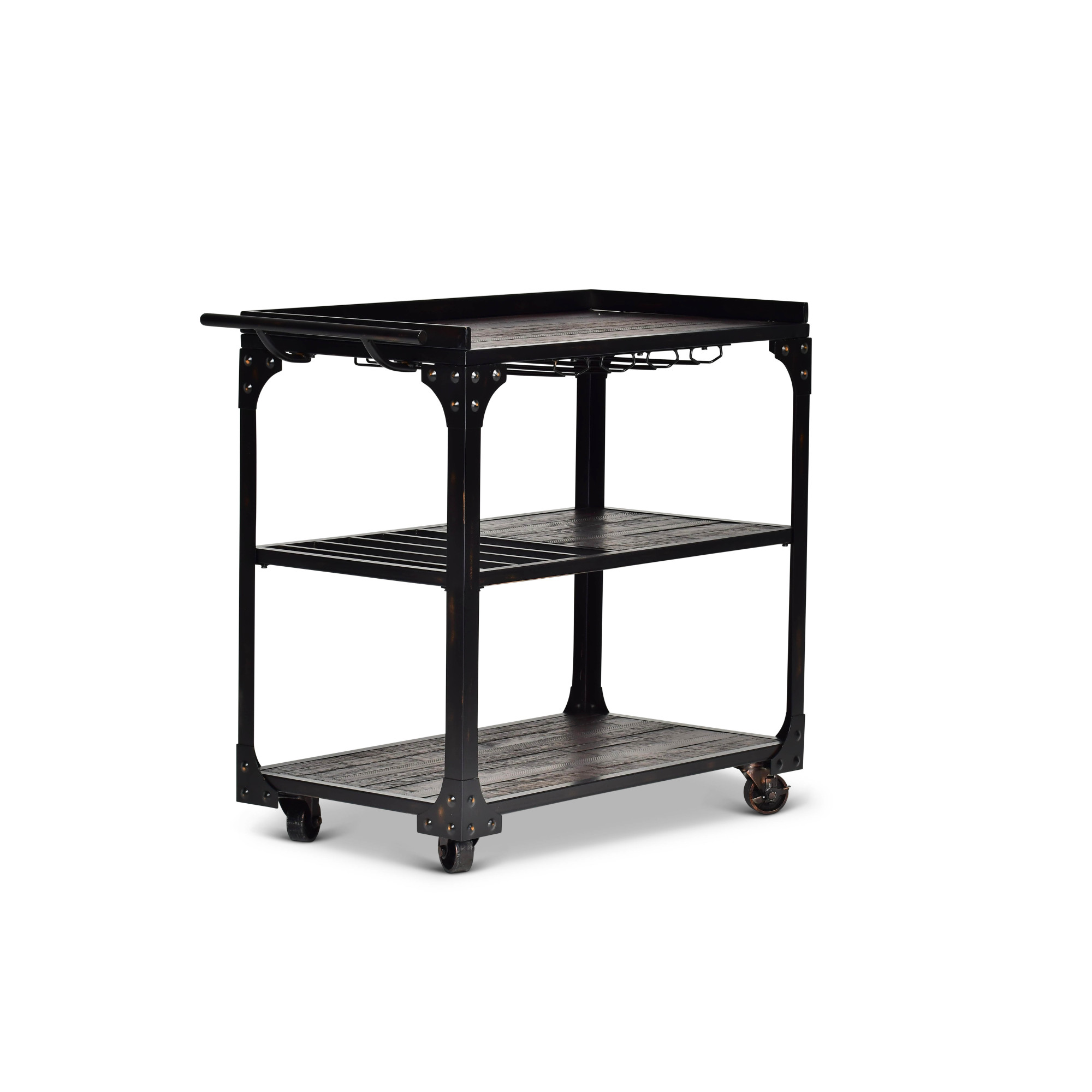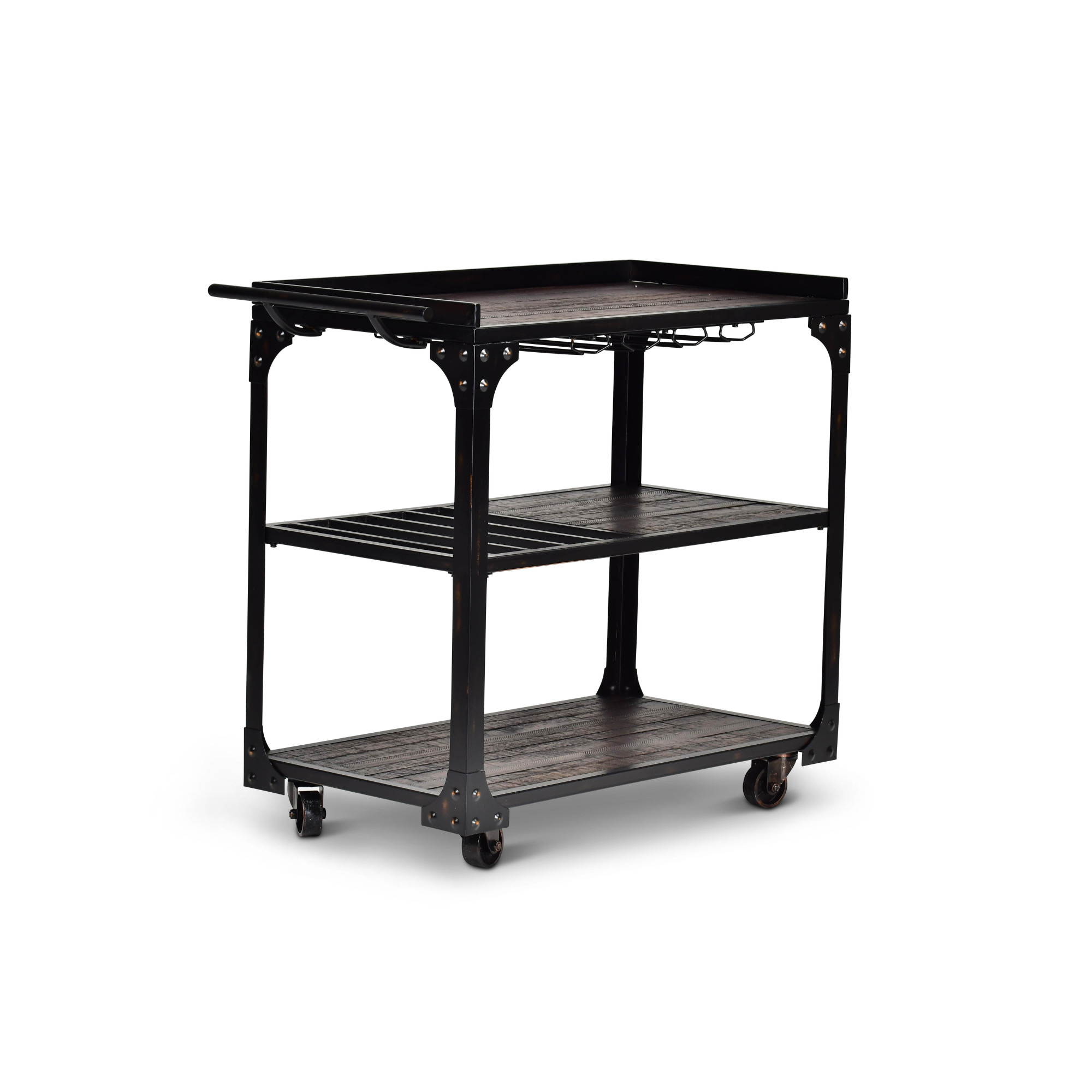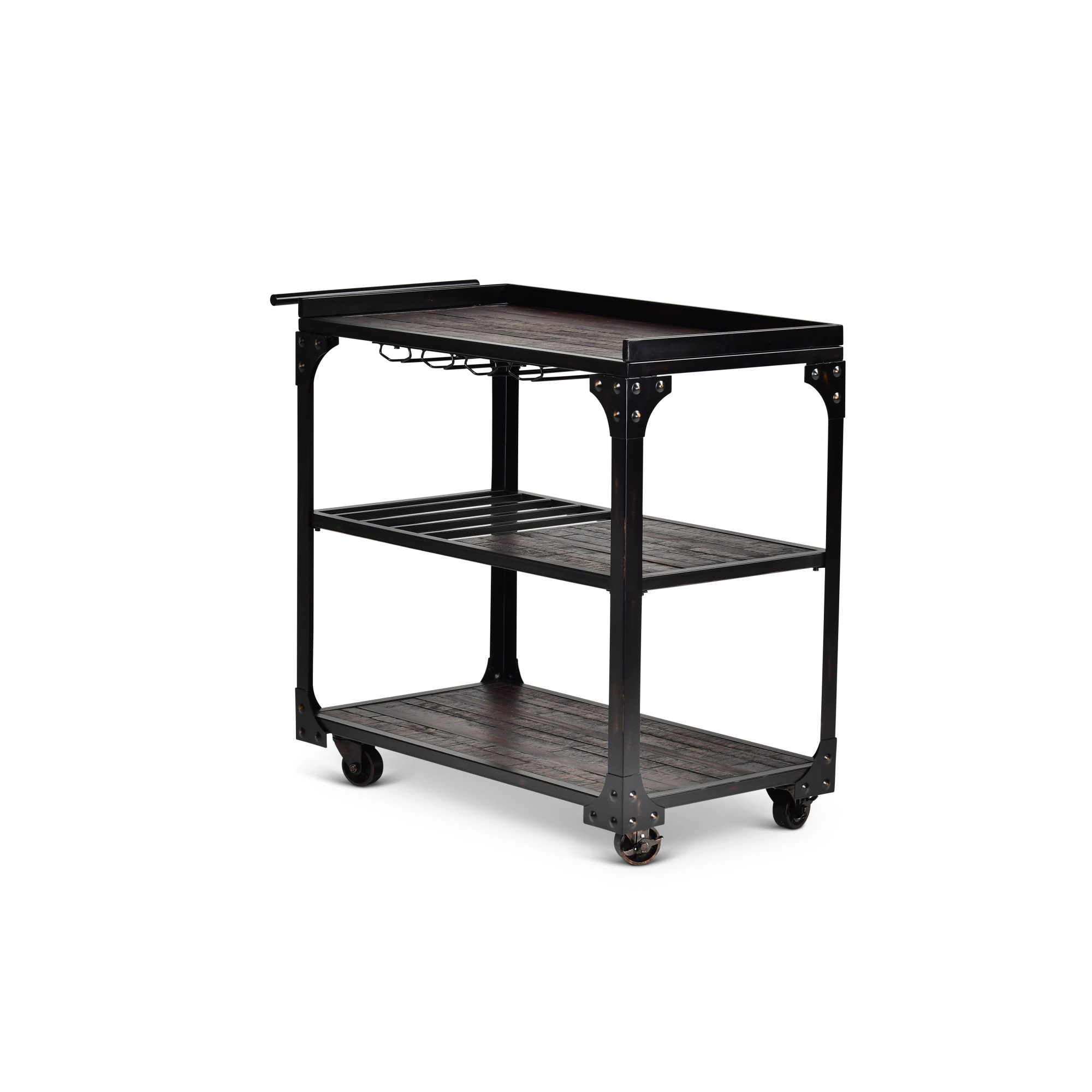 The bar cart in the Sherlock collection offers rustic styling in a rugged mix of hardwood solids and iron with a dark charcoal finish. The bar cart offers plenty of functionality for hanging stemware and bottle storage with casters for easy mobility.Pair with Sherlock tables for a great looking living area combination.