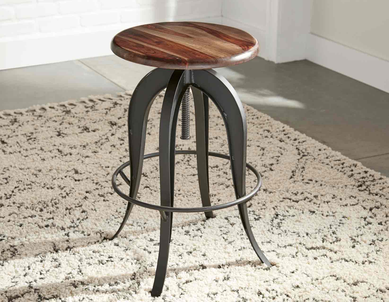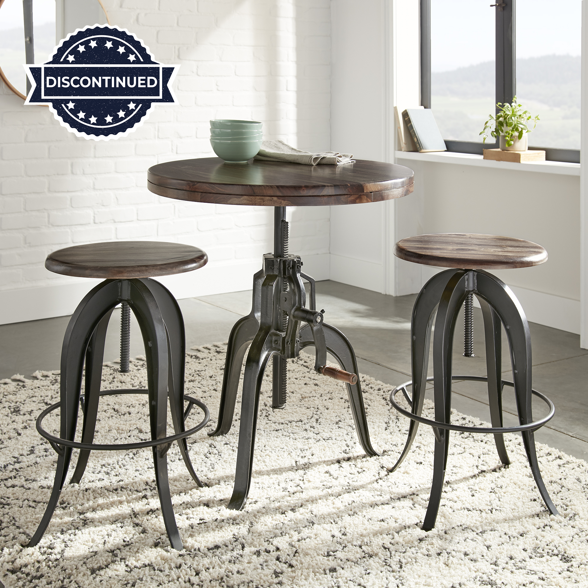 If you’re wondering what has no arms, no legs, but lots of swivel, the Sparrow Round Bar Stool is the answer. This classic style bar stool is designed to go along with the Sparrow Round Crank Pub Table, but can also work very nicely on its own. The smooth wooden seat provides a stable place to rest, with four gracefully carved wooden legs that touch the floor in four points for added sturdiness. A circular metal foot rest completes the look. The stool’s height is customizable by raising or lowering it with a simple turn.