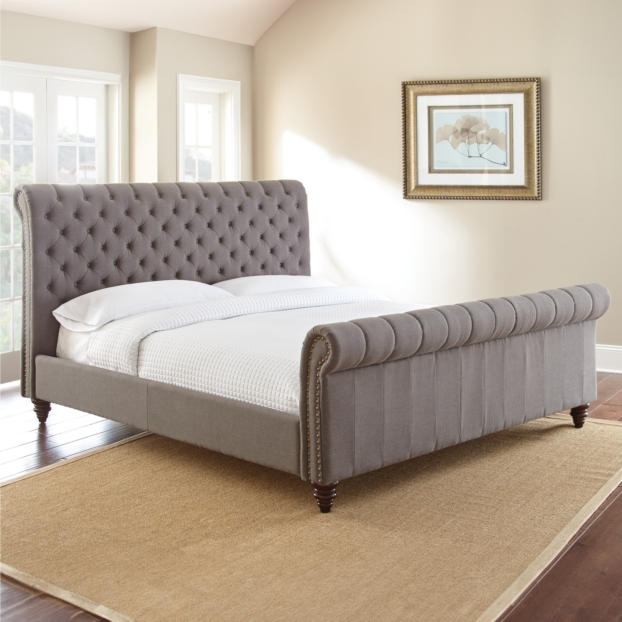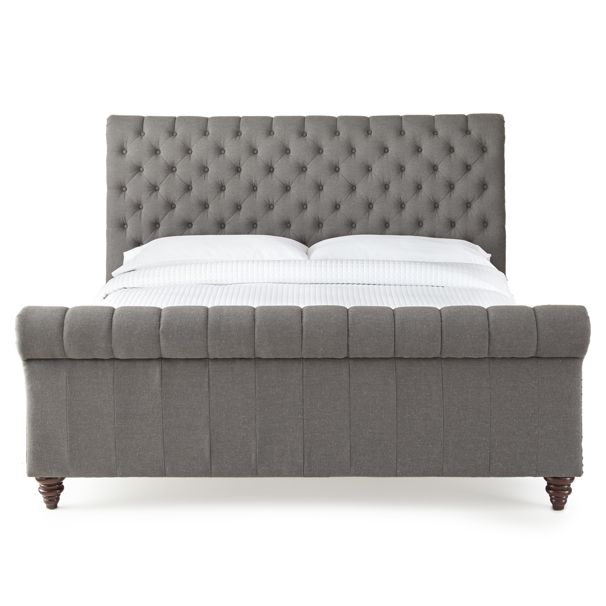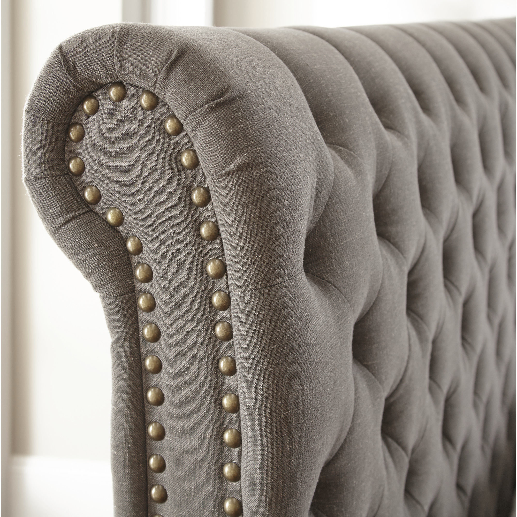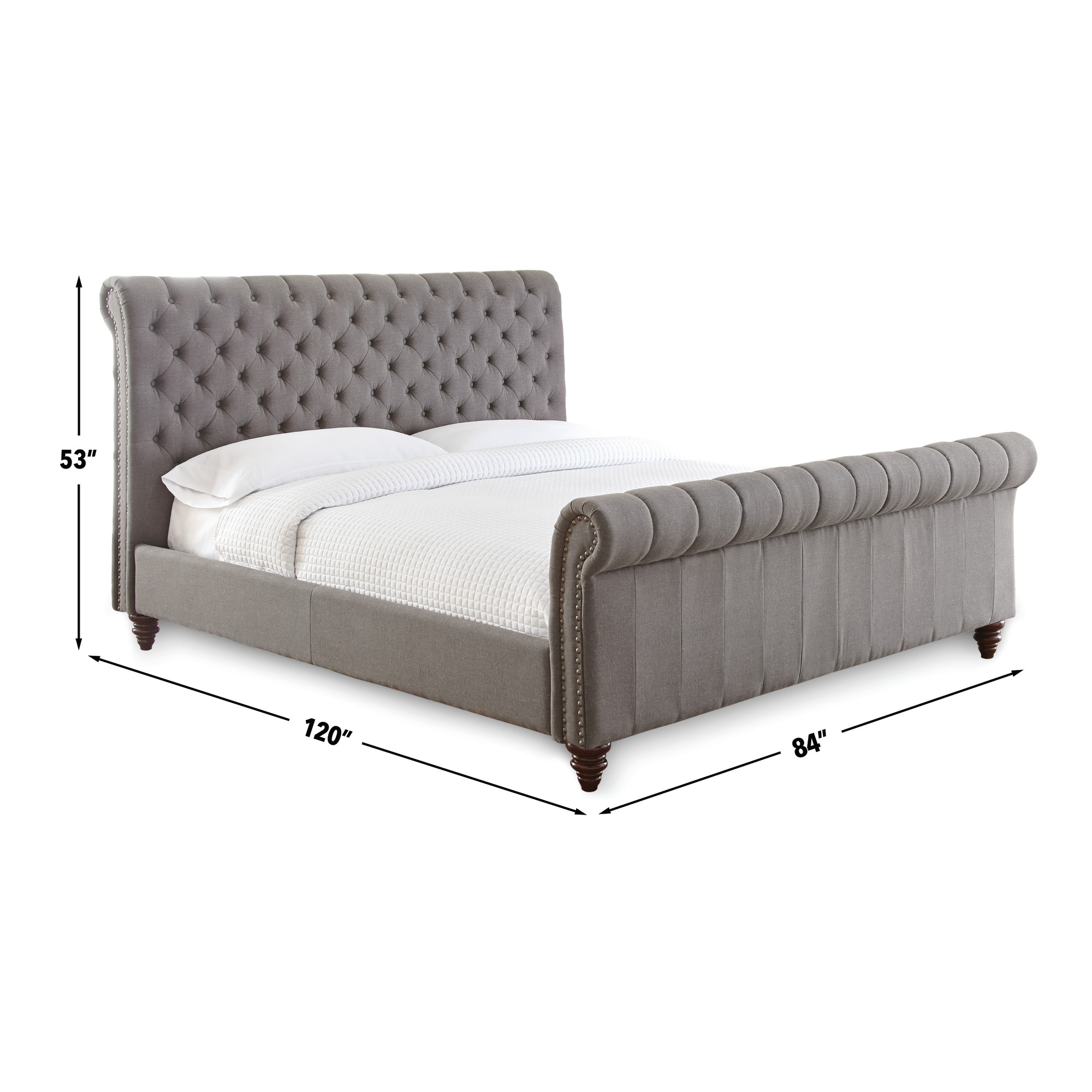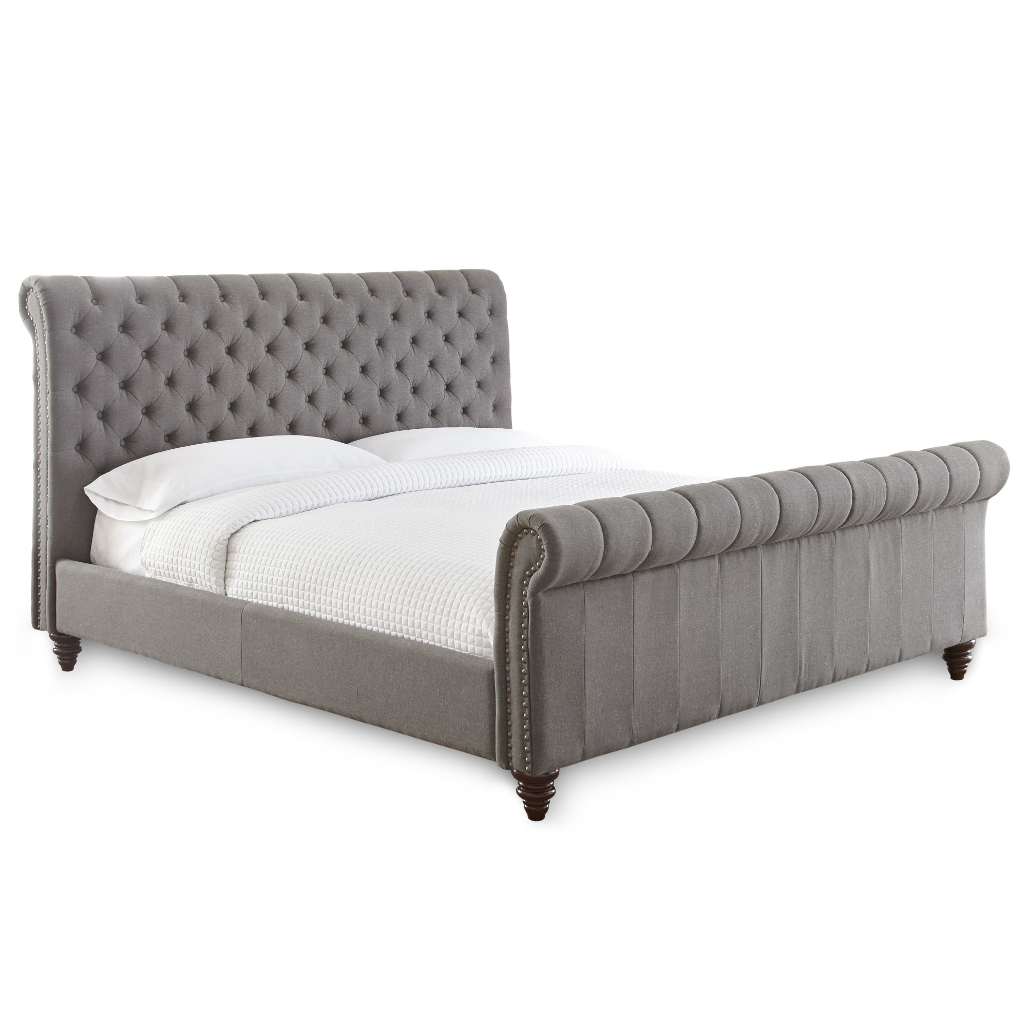 - Styling details include tufted rolled headboard and footboard panel with nailhead trim and solid wood turned feet