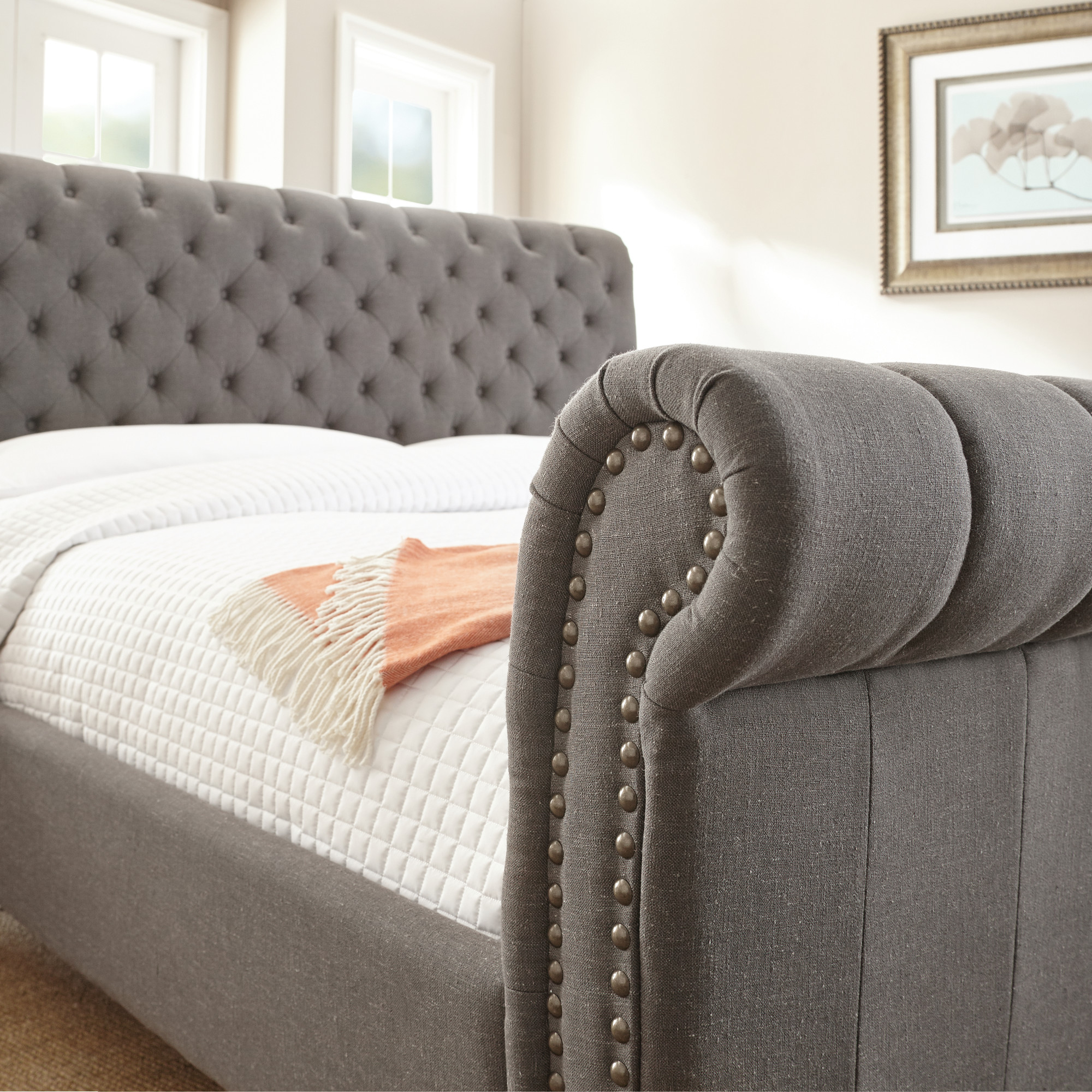 - Upholstered sleigh bed available in king or queen sizes