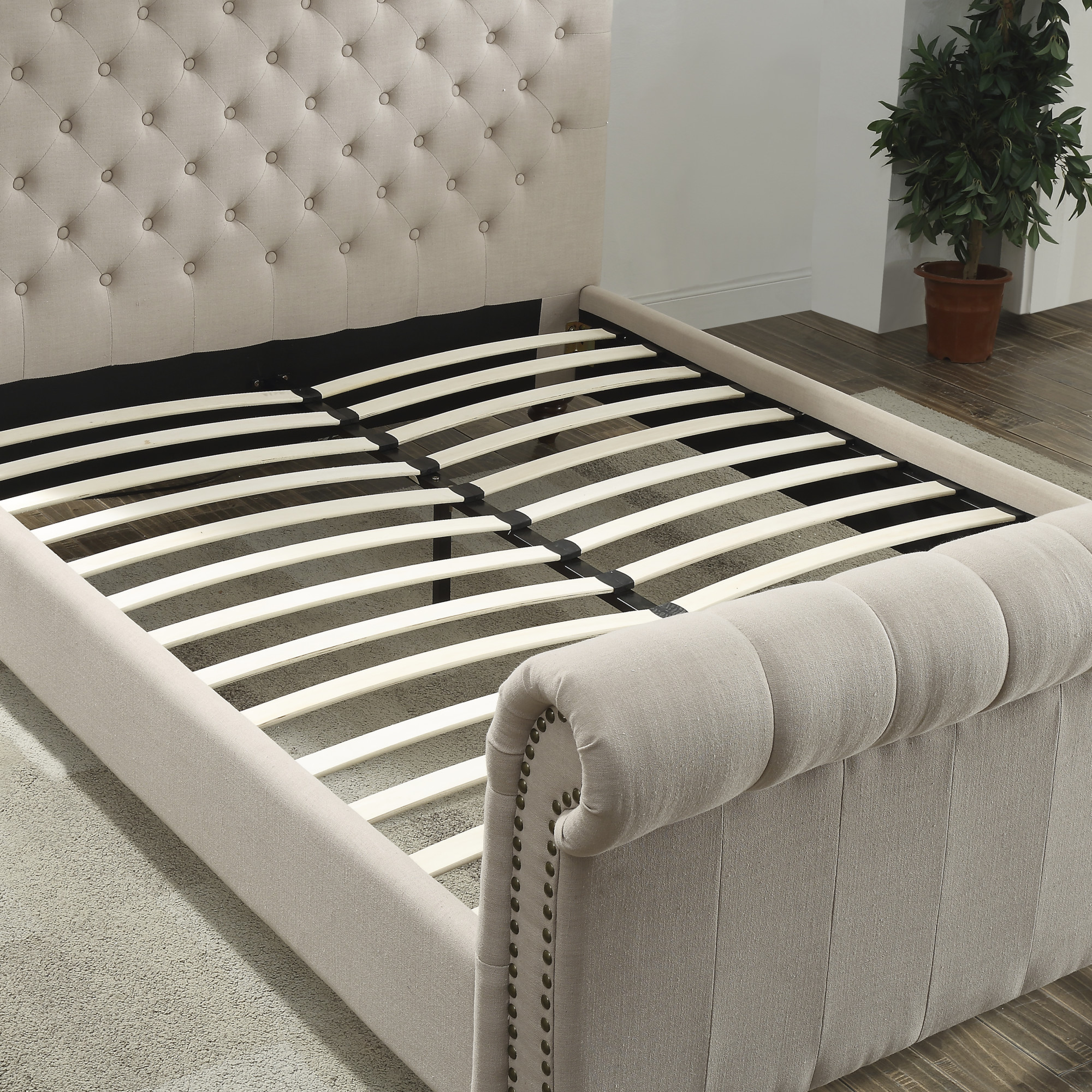• Styling details include tufted rolled headboard and footboard panel with nailhead trim and solid wood turned feet