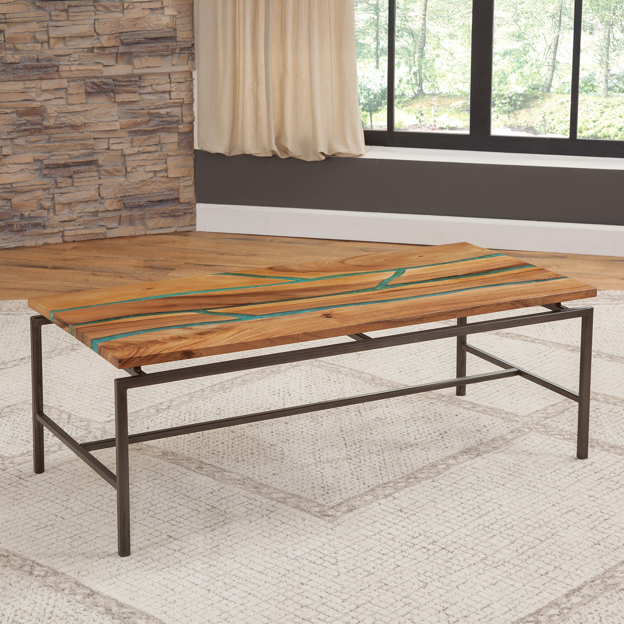 As natural as a living room table group can be, Tamra features nature’s landscape supported by a stylish tubular metal base. A solid wood top is inlaid with beautifully contrasting emerald resin to smooth the table surface and create a visual masterpiece crafted by nature. The beauty and character of the table shine as the natural contrasts and grain of the wood add to the elegance of the table.