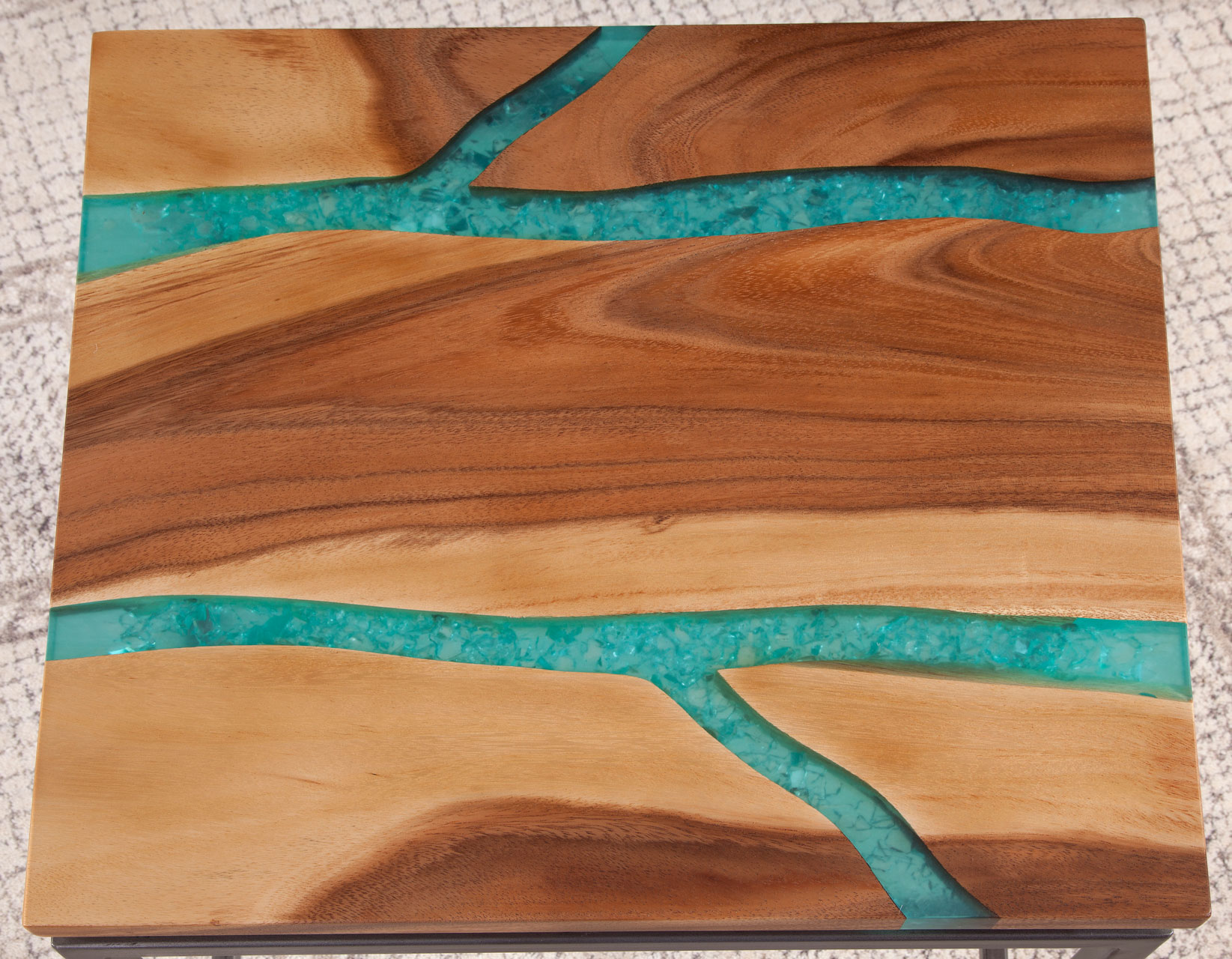 - Constructed of solid acacia wood with inlaid resin and tubular metal base