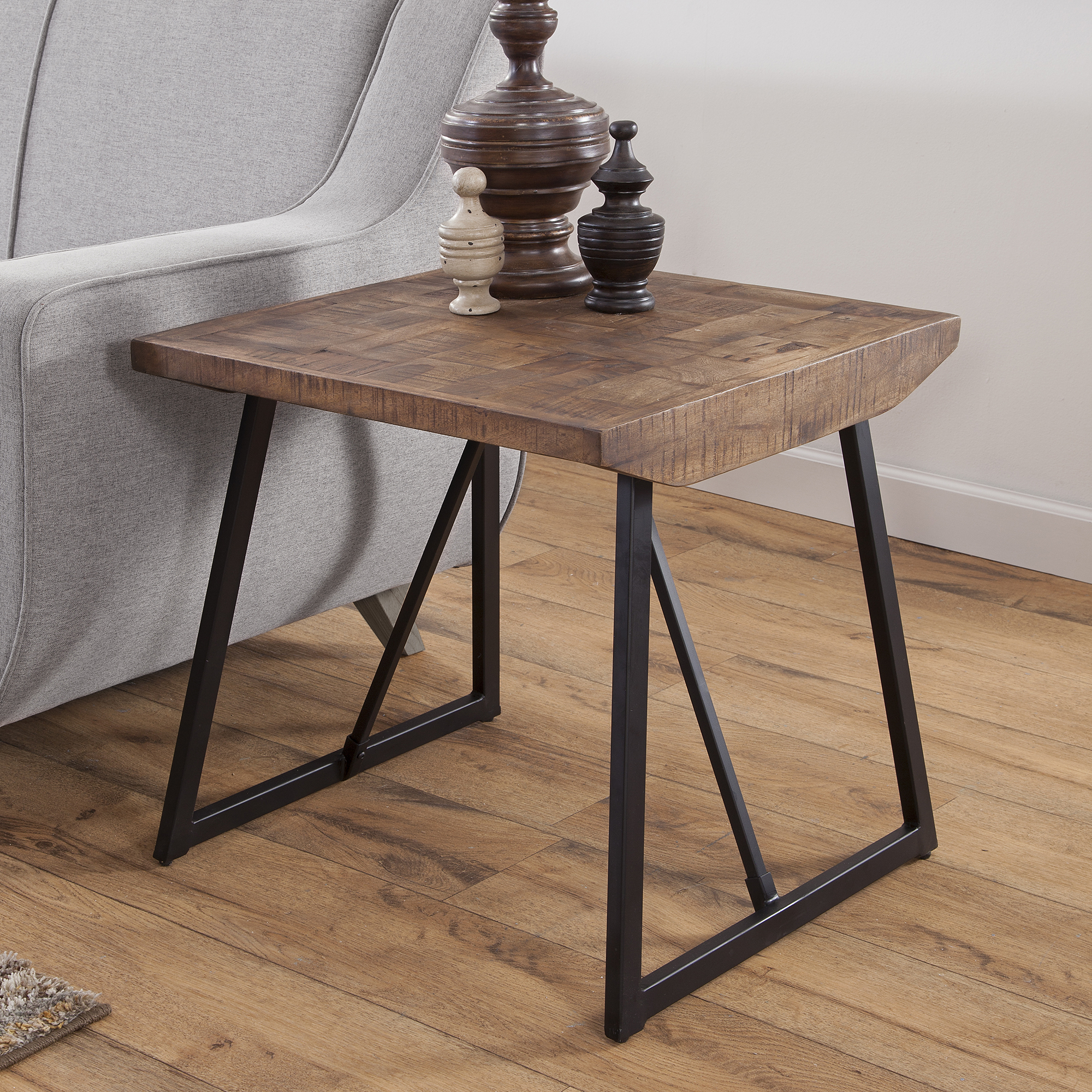 A transitional styled Side Table for living room or bedroom, the Walden End Table brings mixed media and excellent craftmanship to brighten any room. A neutral black iron base complements the lustrous chestnut finished top laid in a signature parquet pattern. Lively, rustic and eclectic, Walden can complement any decor.