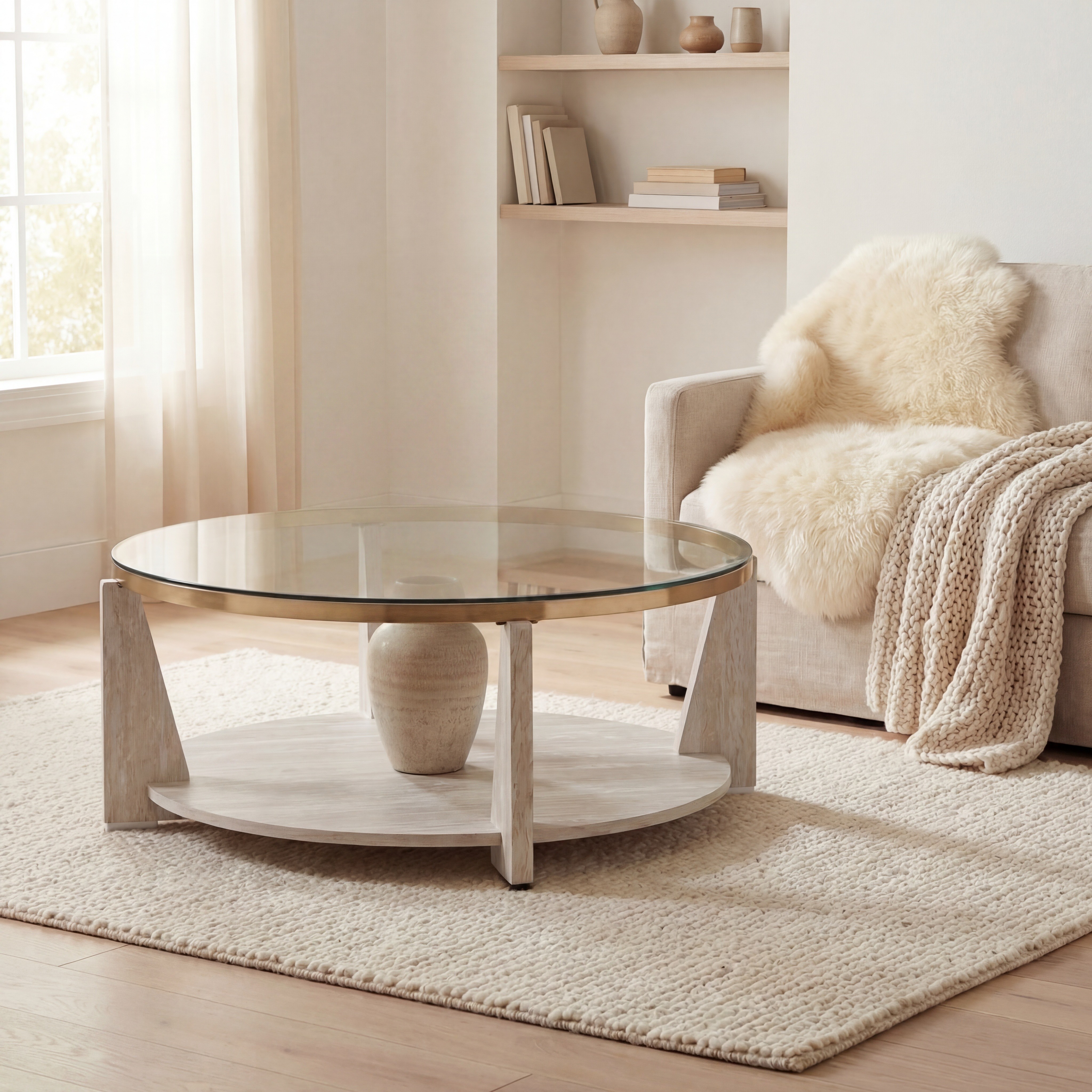 With its modern profile and sleek 42″ round shape, the Wanda Castered Glass Top Coffee Table serves as a stunning centerpiece for any room. The tempered glass top provides a chic display space, beautifully showcasing items on the lower shelf. A satin brass band adds a touch of luxury, perfectly complementing the faux stone base that delivers the sophisticated look of stone at an affordable price. Architectural supports create a striking contrast with the round base, while convenient casters ensure effortless mobility for cleaning or repositioning.